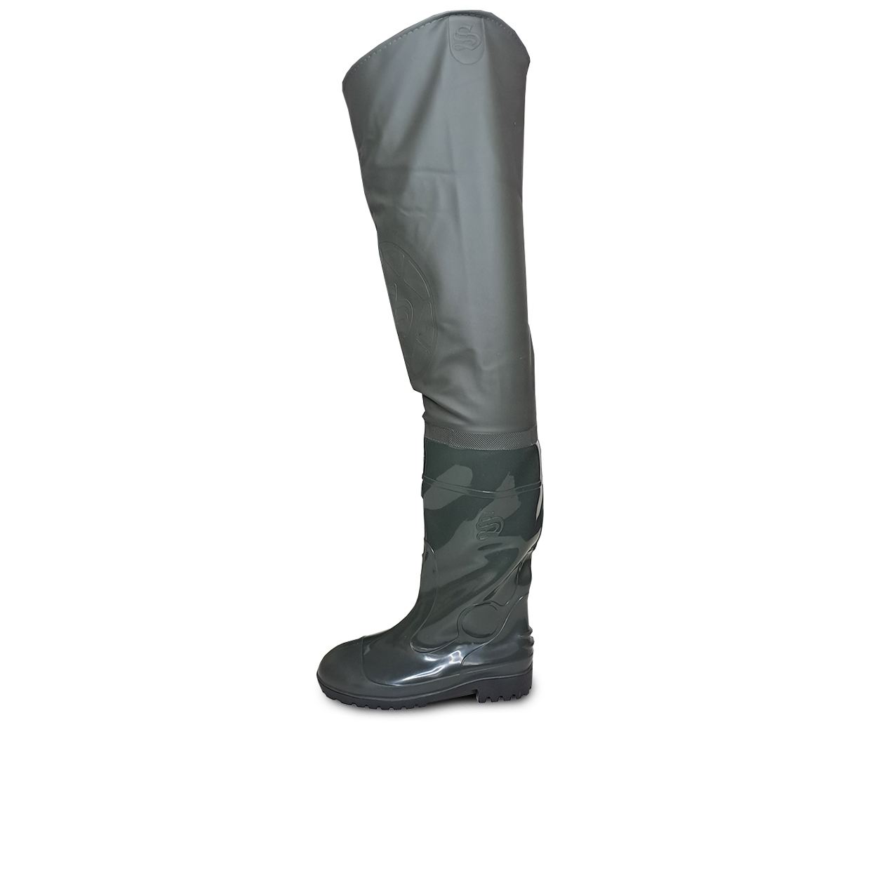 Сапоги ПВХ рыбацкие регулируются по длине на бретелях. Верхняя часть герметично соединена с сапогами. Модель изготавливается на базе рабочих сапог. Изделие полностью водонепроницаемо. Наколенники выполнены из винтитола и поролона. На заказ сапоги могут быть изготовлены с металлическим защитным носком (Мун 200) и проколозащитной металлической стелькой (1200 Н).
