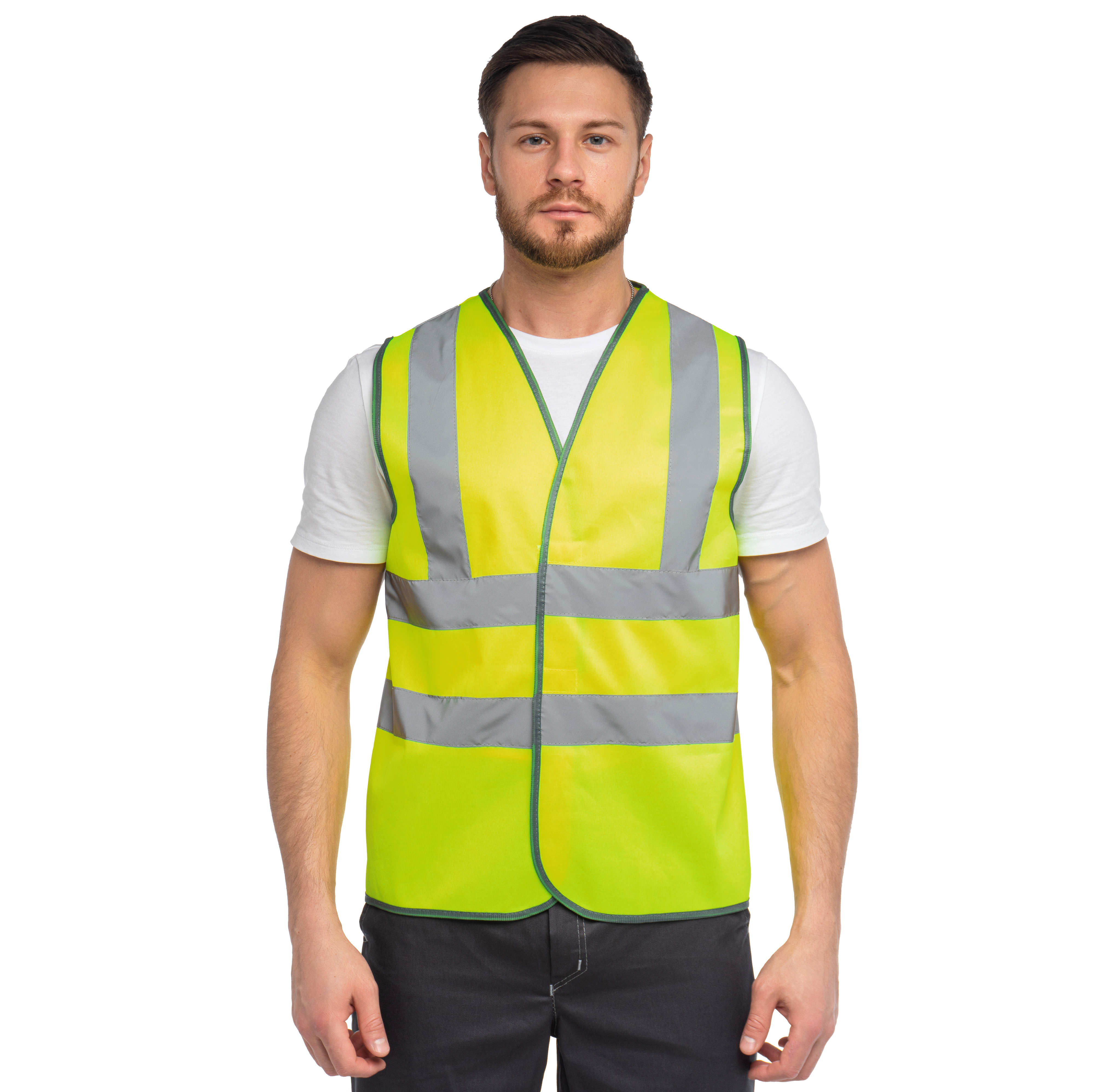 Жилет сигнальный изготовлен в соответствии с ГОСТ. Изделие выполнено из трикотажного полотна (100% ПЭ, плотностью120 гр./м², ВО отделкой). Для безопасной работы сотрудника в местах с плохим освещением на сигнальном жилете предусмотрено 4 светоотражающих полосы 50 мм.Объем регулируется по ширине на 4 см, за счет удлинённой ответной части липучки.