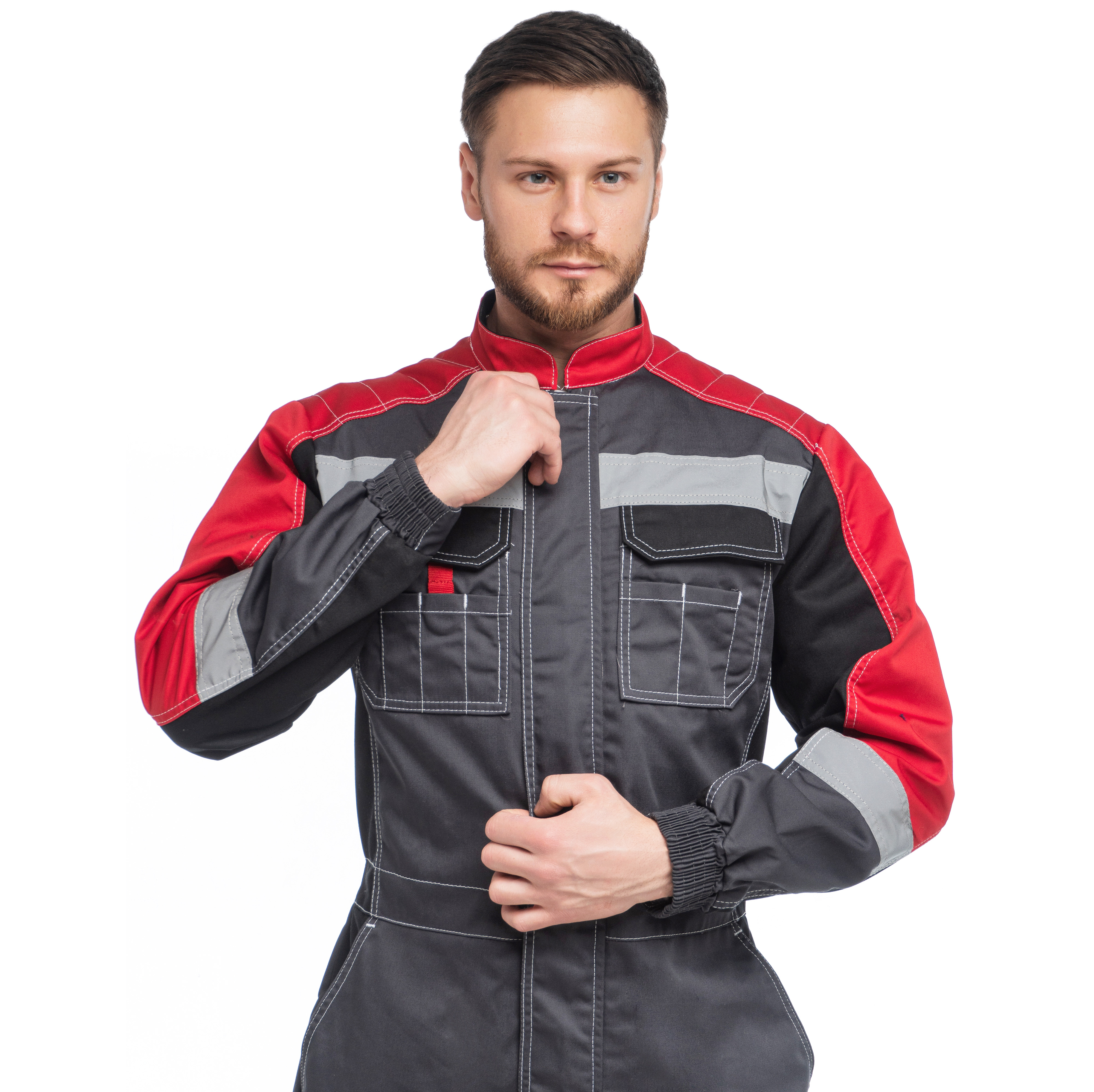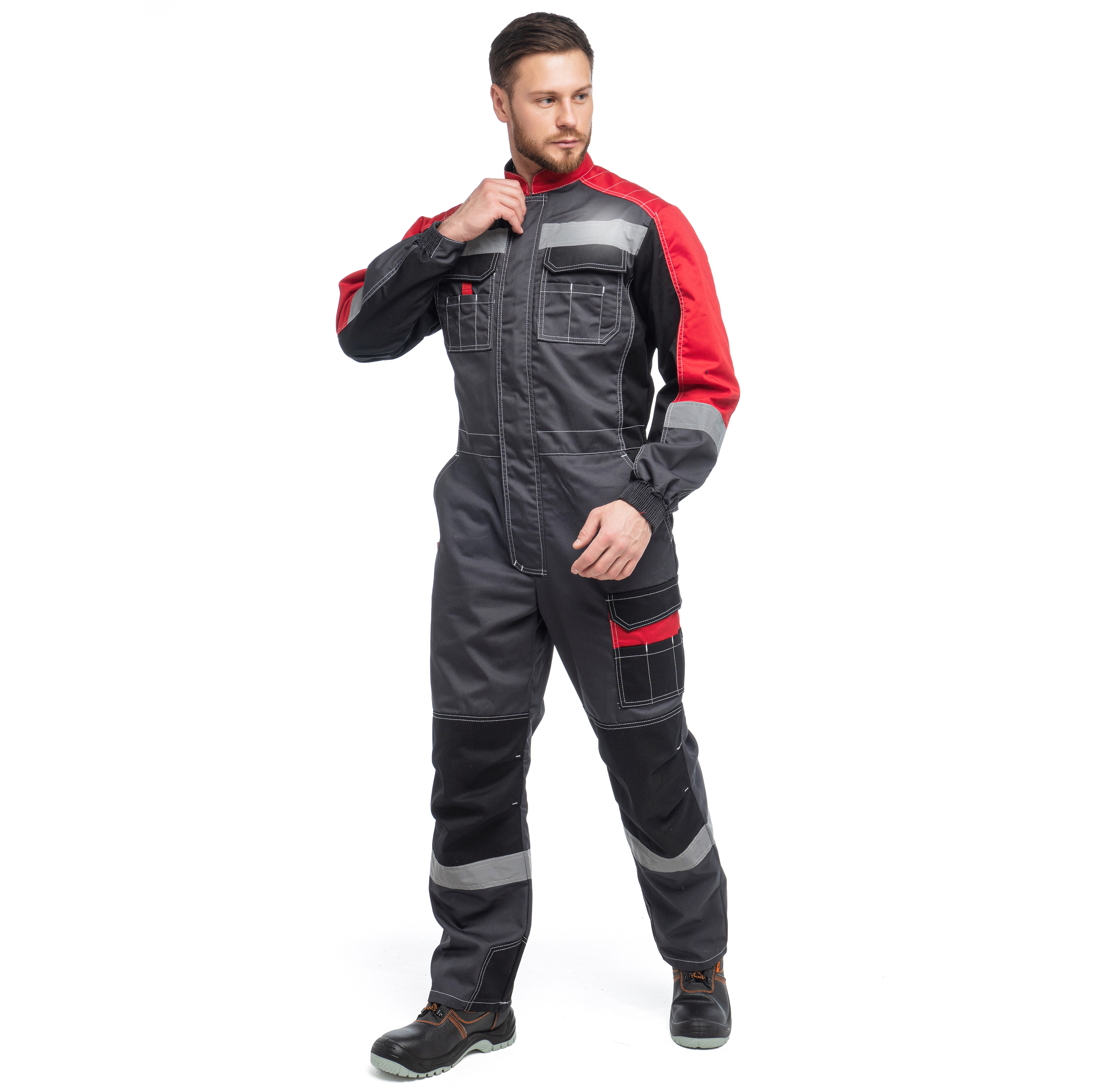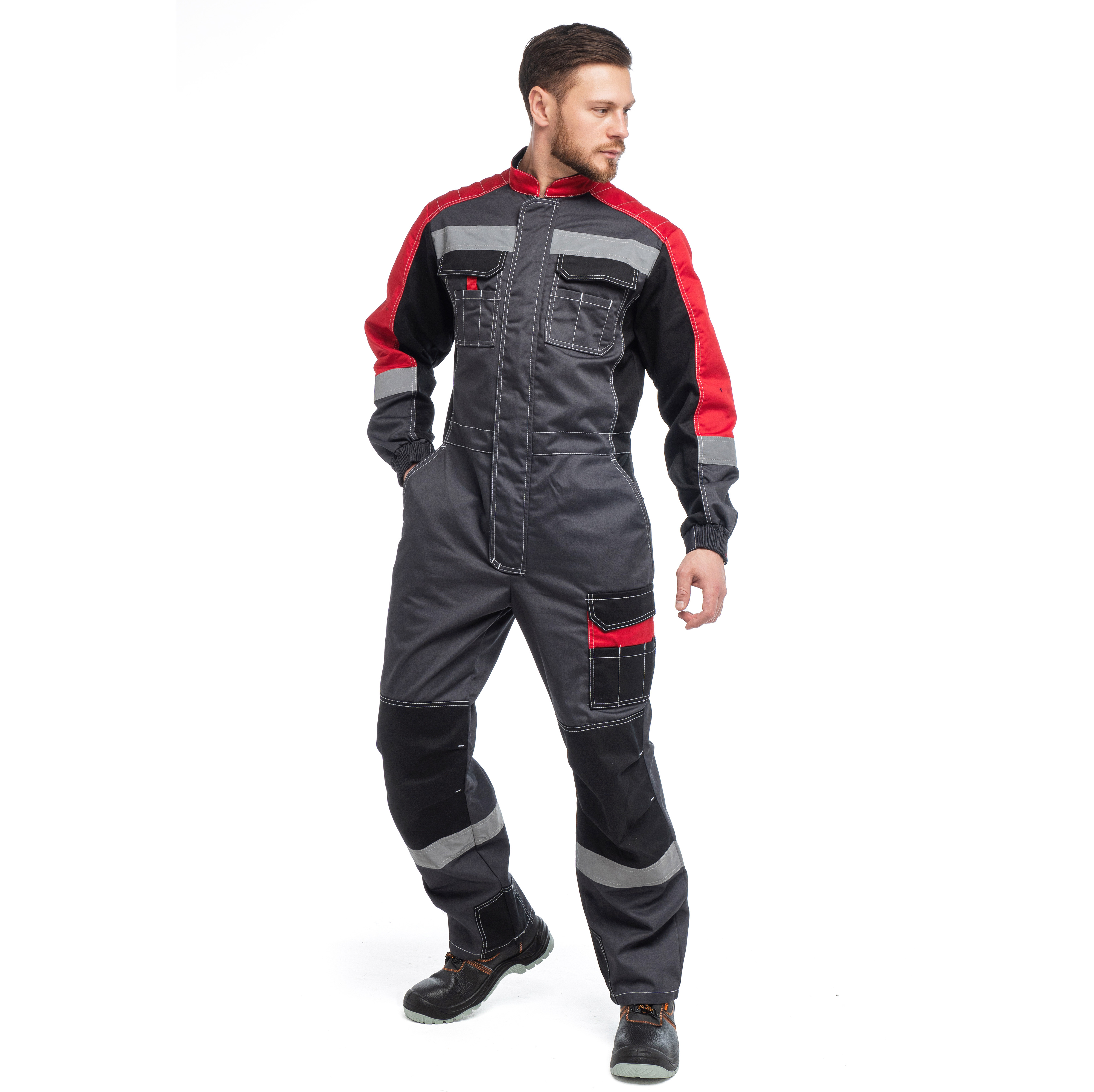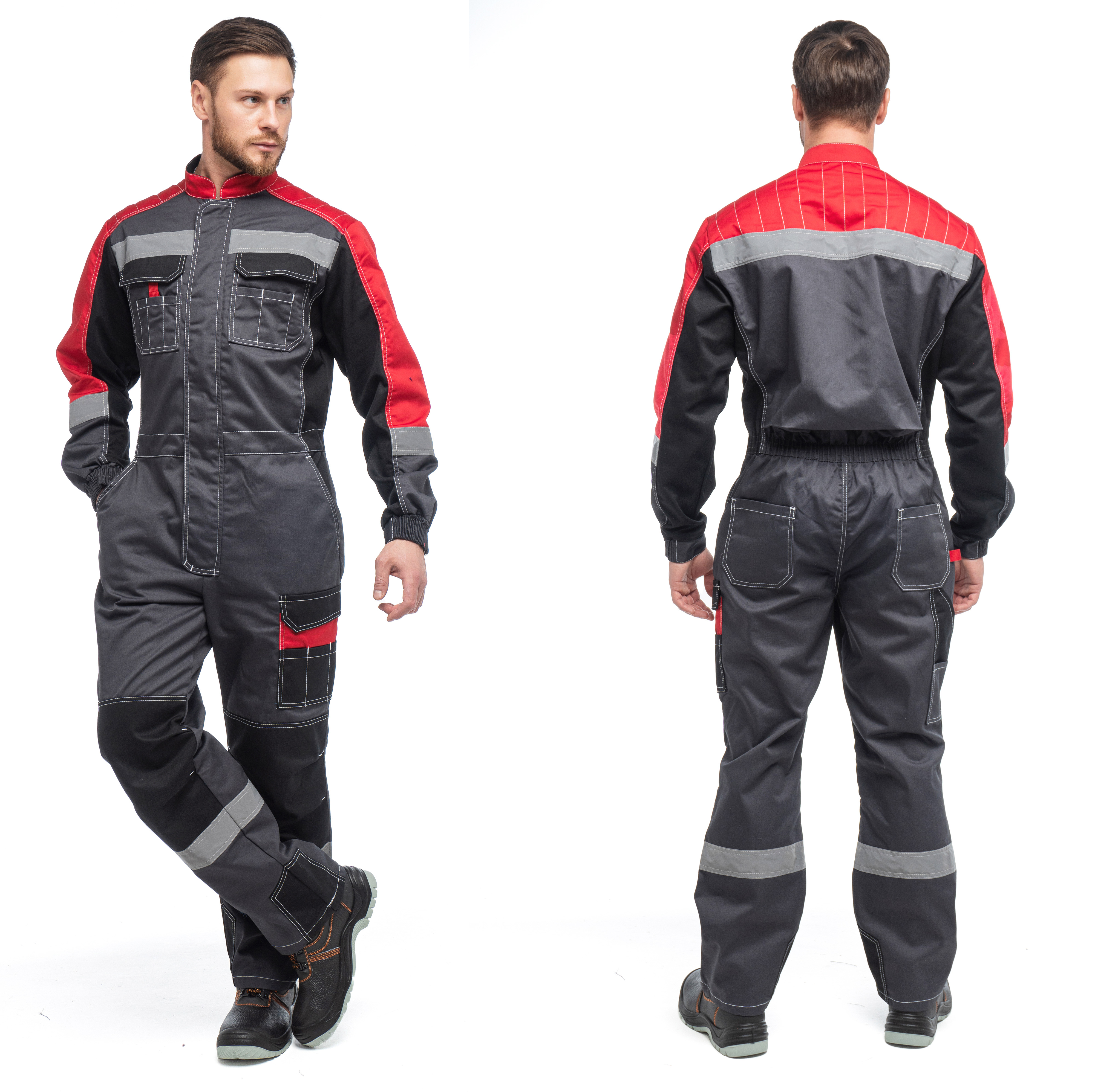 Комбинезон "ФОРМУЛА" изготовлен в соответствии с ГОСТ. Изделие закрывается на молнию, закрытую ветрозащитной планкой на липучку и оснащено фигурным воротником-стойкой. В области подмышечных впадин находится вентиляционные отверстия из сетки. На модели расположены верхние накладные фигурные карманы с фигурными клапанами на липучку. Изделие оснащено держателем-полукольца для бейджа. Эластичной резинка по талии спинки обеспечивает комфортную посадку. На комбинезоне расположены задние фигурные накладные карманы, карманы под инструменты и накладной карманом с фигурным клапаном на липучку на боковом шве. Усилительными накладками в области коленей и по шаговому шву обеспечивают дополнительную защиту. Для безопасной работы сотрудник в комбинезоне "ФОРМУЛА" предусмотрена световозвращающая лента шириной 50 мм.