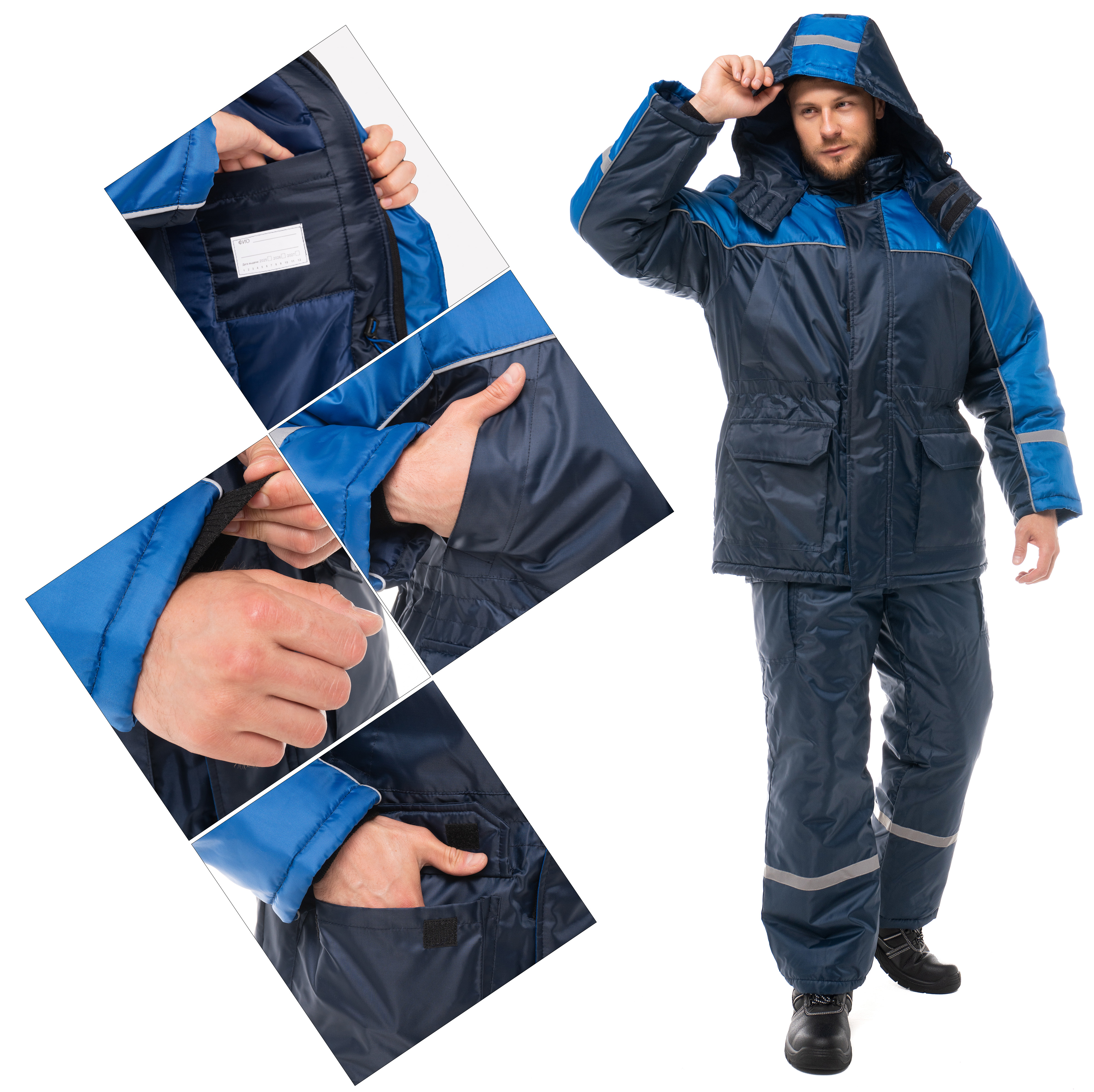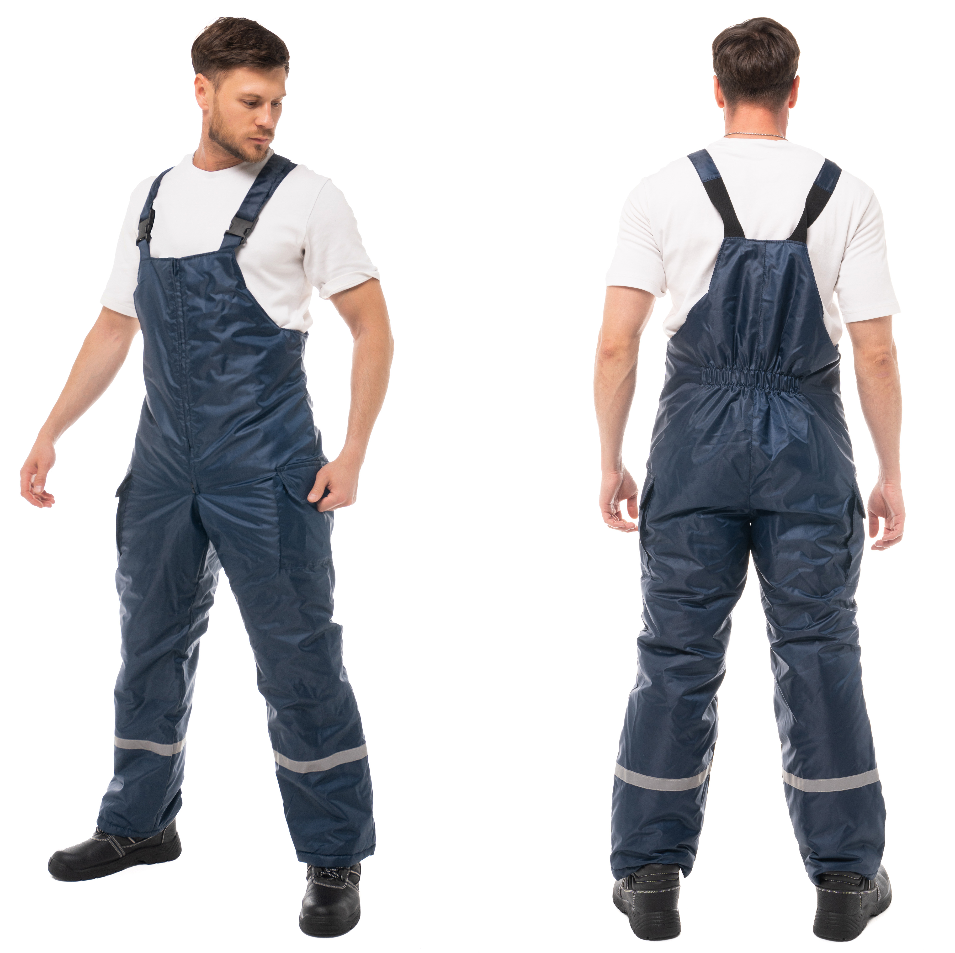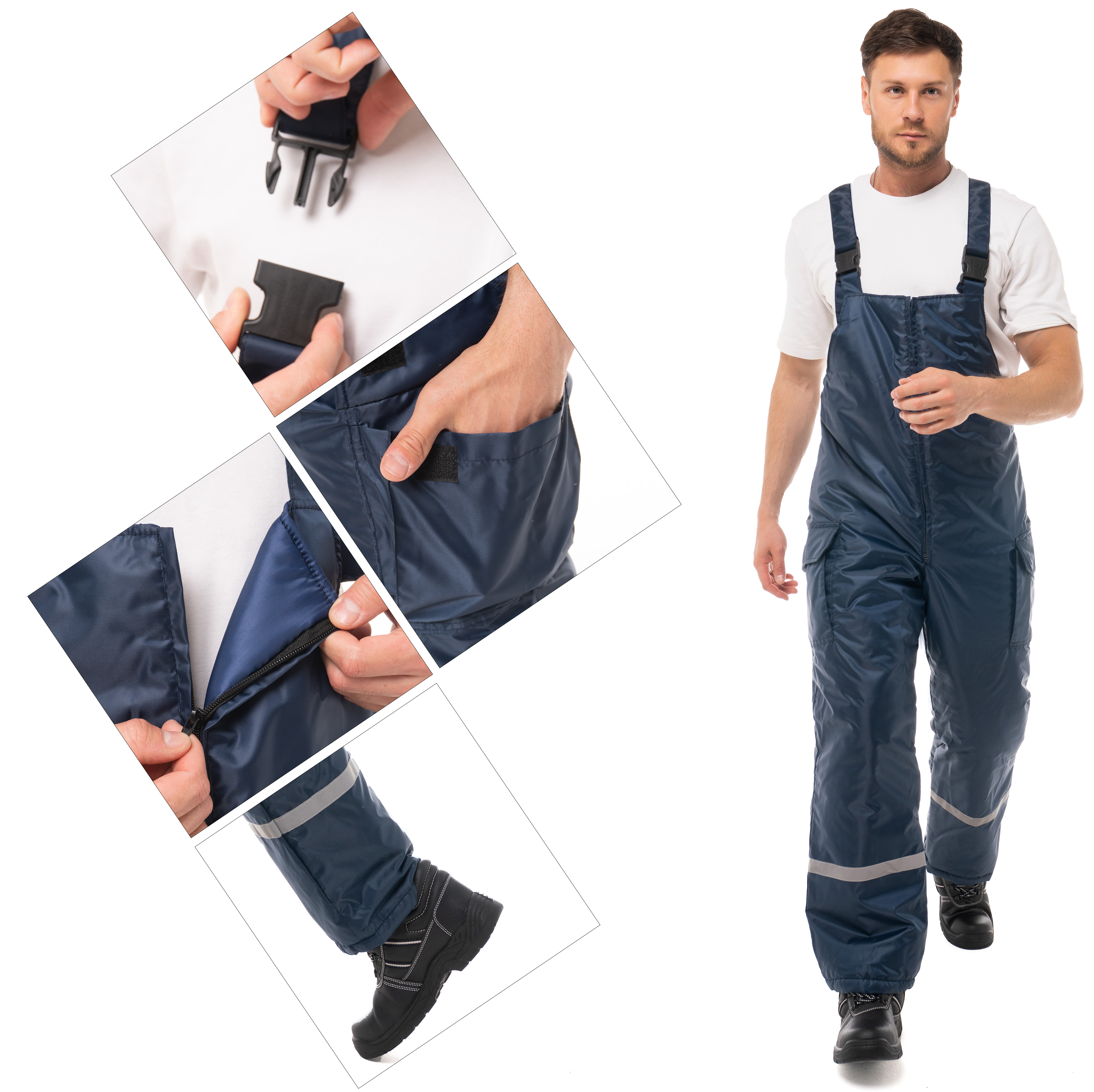 Центральная застежка утепленного полукомбинезона - молния. Боковые объемные карманы с клапанами на ленте-контакт. На спине вдоль линии талии есть эластичная резинка для регулировки посадки. Для безопасной работы сотрудника в местах с плохим освещением на костюме «Антей» предусмотрена световозвращающий кант и полоса шириной 25 мм.