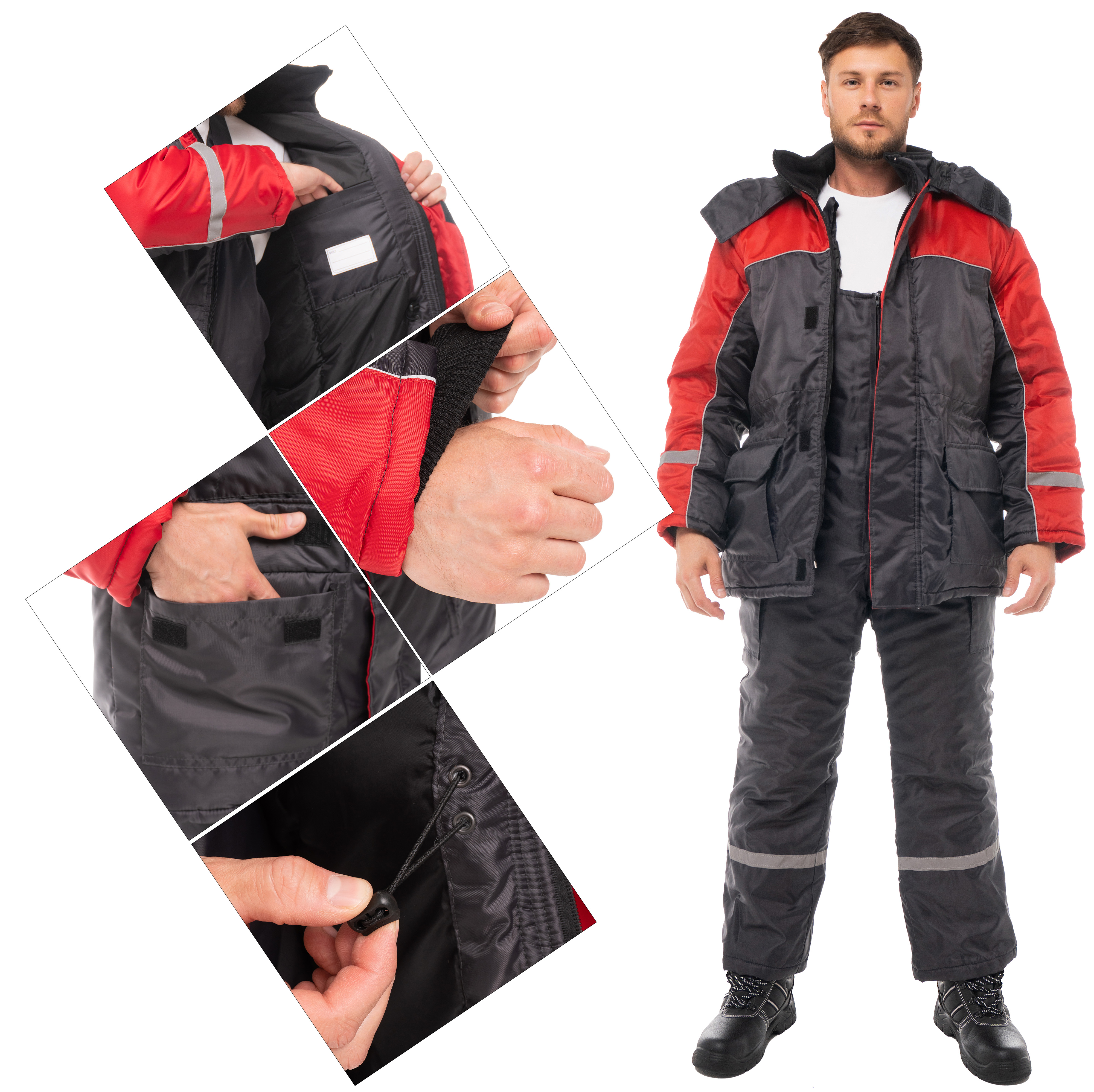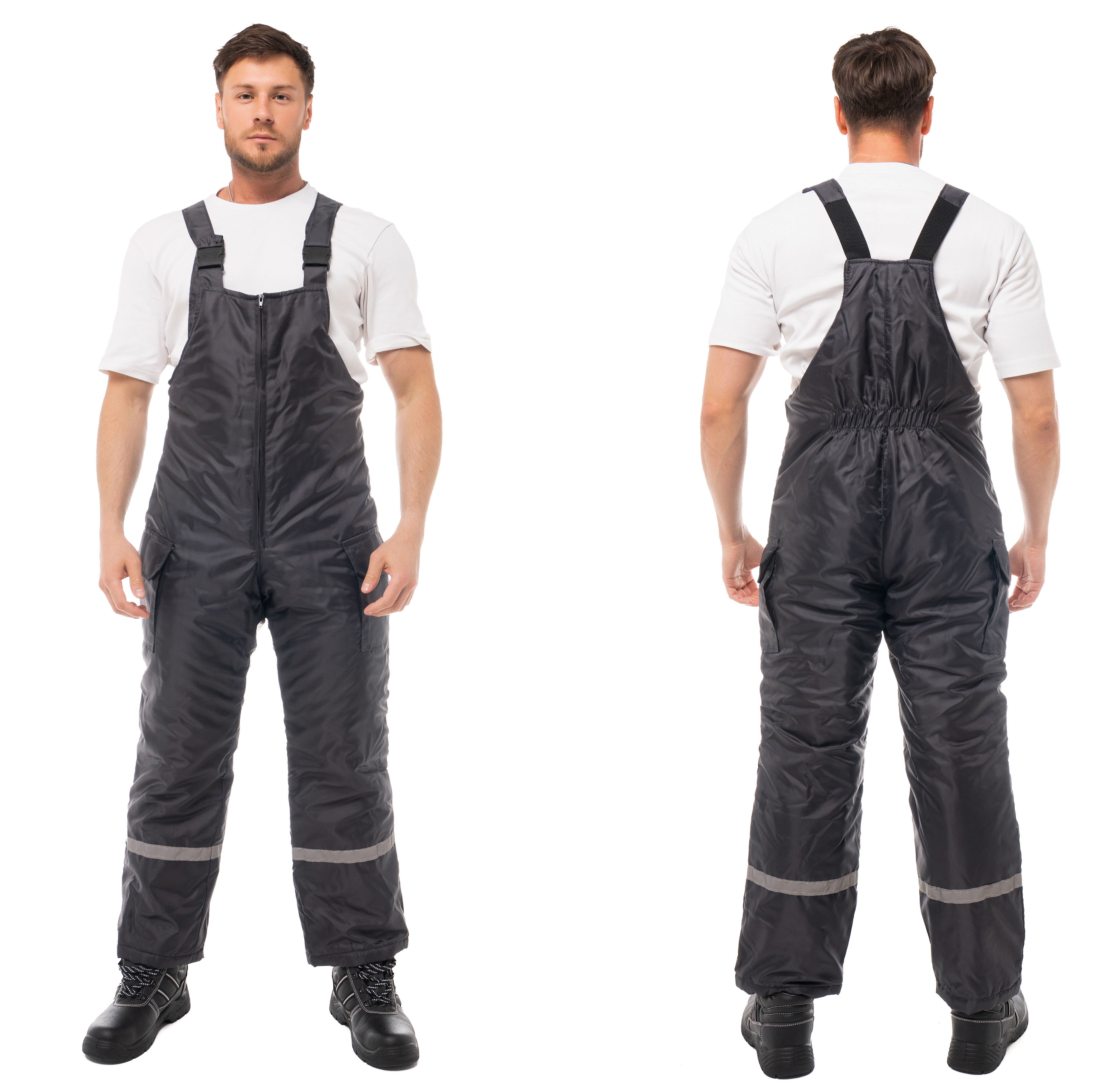 Центральная застежка утепленного полукомбинезона - молния. Боковые объемные карманы с клапанами на ленте-контакт. На спине вдоль линии талии есть эластичная резинка для регулировки посадки. Для безопасной работы сотрудника в местах с плохим освещением на костюме «Антей» предусмотрена световозвращающий кант и полоса шириной 25 мм.