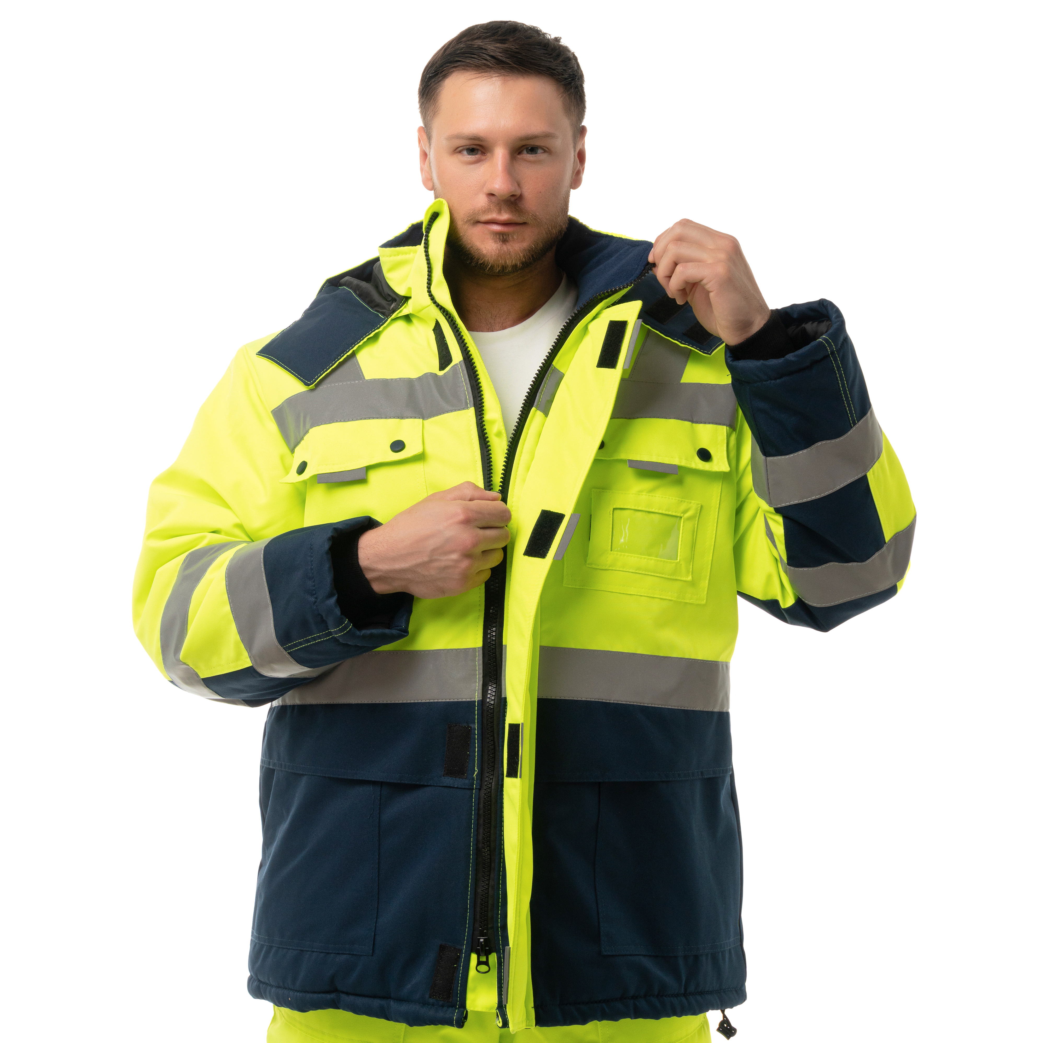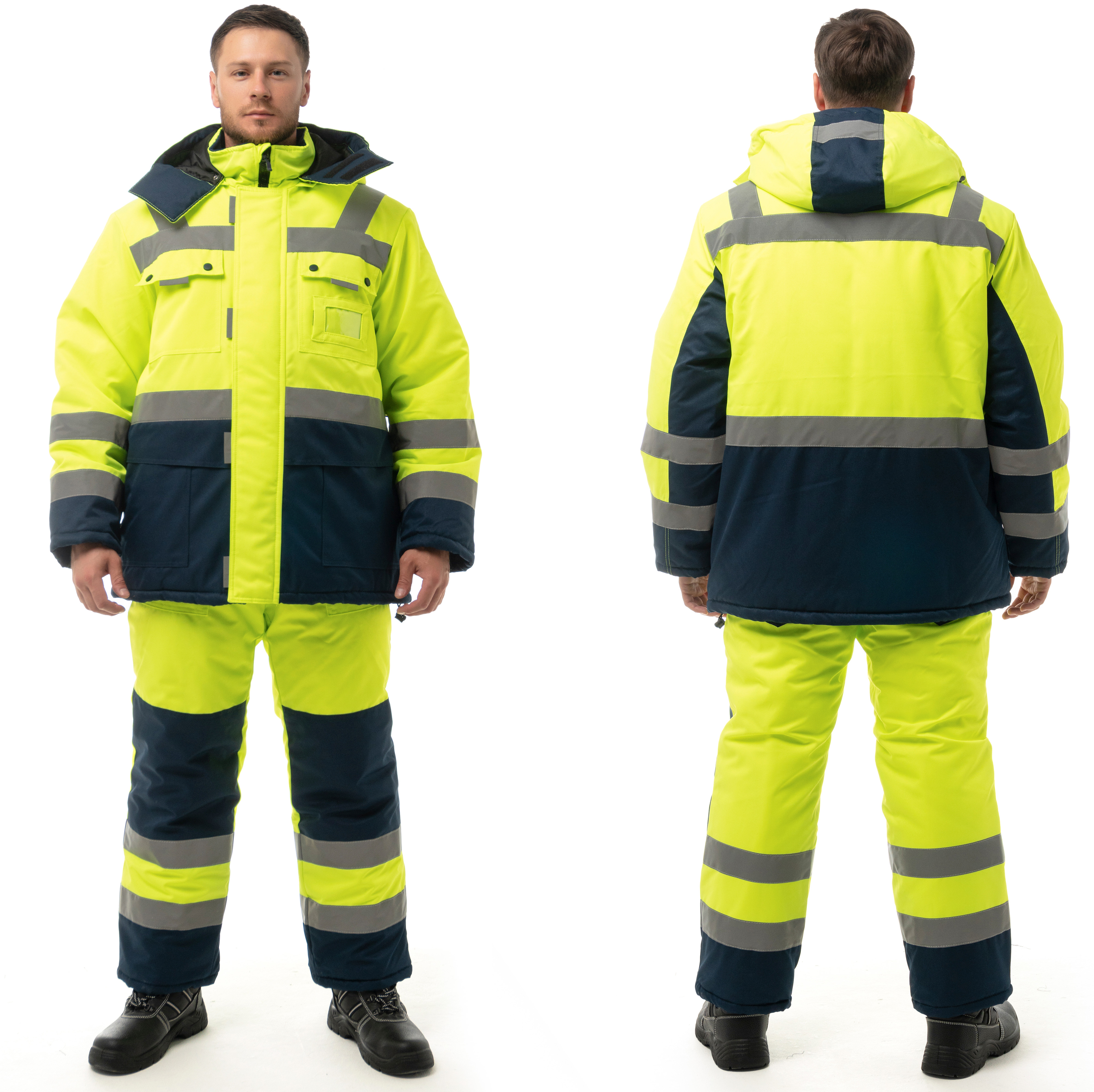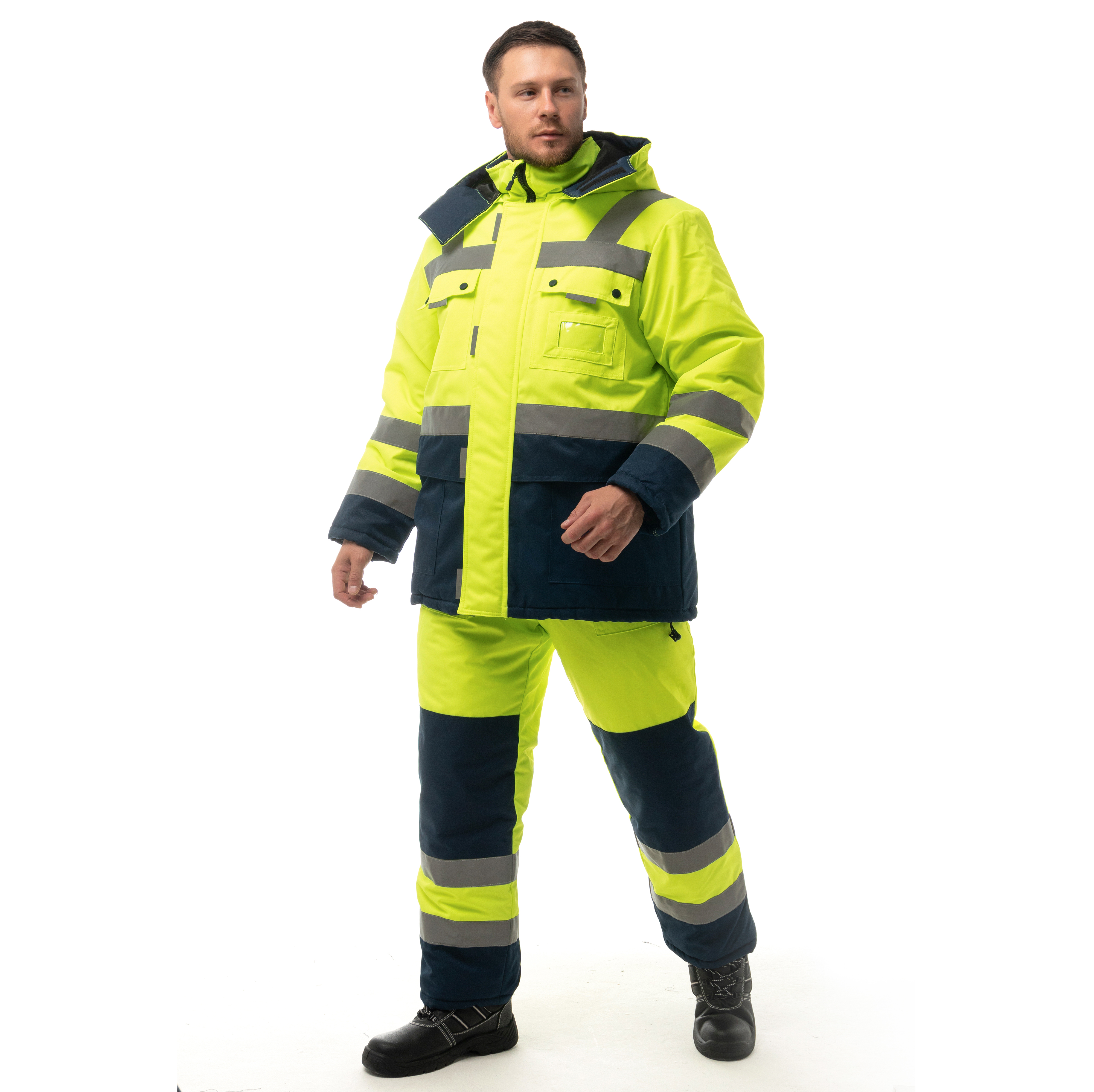 Костюм утепленный "НОРДИК" изготовлен в соответствии с ГОСТ и включает в себя два предмета: куртка / полукомбинезон. Центральная застежка изделия – молния с ветрозащитной планкой на липучку. На модели расположены накладные карманы с клапанами на кнопках, карман для бейджа, нижние накладные карманы и внутренний карман на подкладке. Для сохранения тепла на куртке предусмотрена ветрозащитная юбка на подкладке и утяжка по низу. Воротник-стойка имеет флисовую подкладку для дополнительного тепла. Костюм оснащен съемным капюшоном, который можно регулировать по объему лицевой части и использовать с каской. Трикотажные манжеты по низу рукавов регулируют посадку. Накладные карманы на передних половинках п/к обеспечивают удобный доступ к необходимым вещам. Для лучшего прилегания на изделии присутствует ткацкая резинка по линии талии. В области колен на задних половинках усилительные накладки. Для безопасной работы сотрудника в местах с плохим освещением на костюме «НОРДИК» предусмотрена световозвращающая лента в 2 ряда.