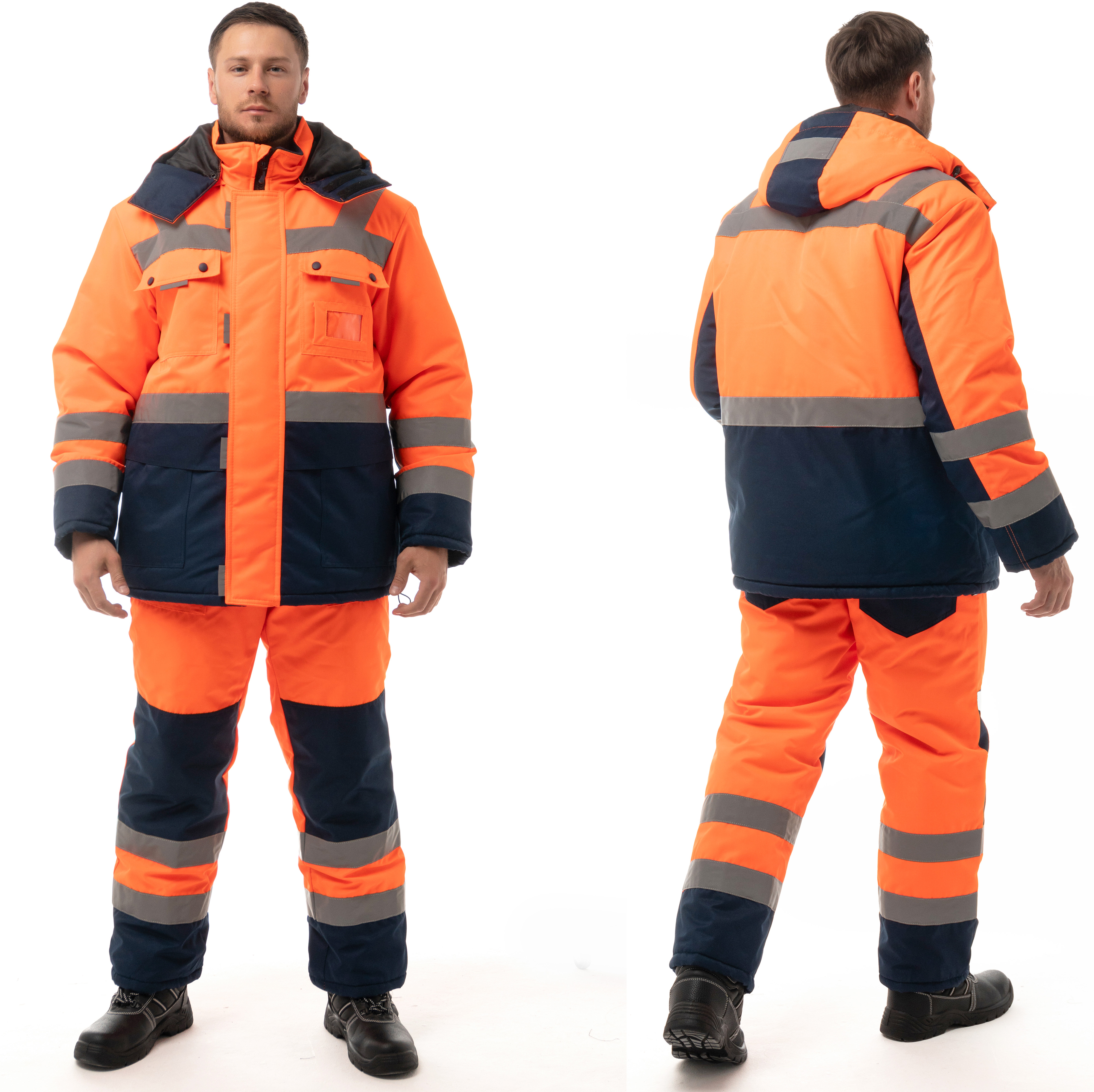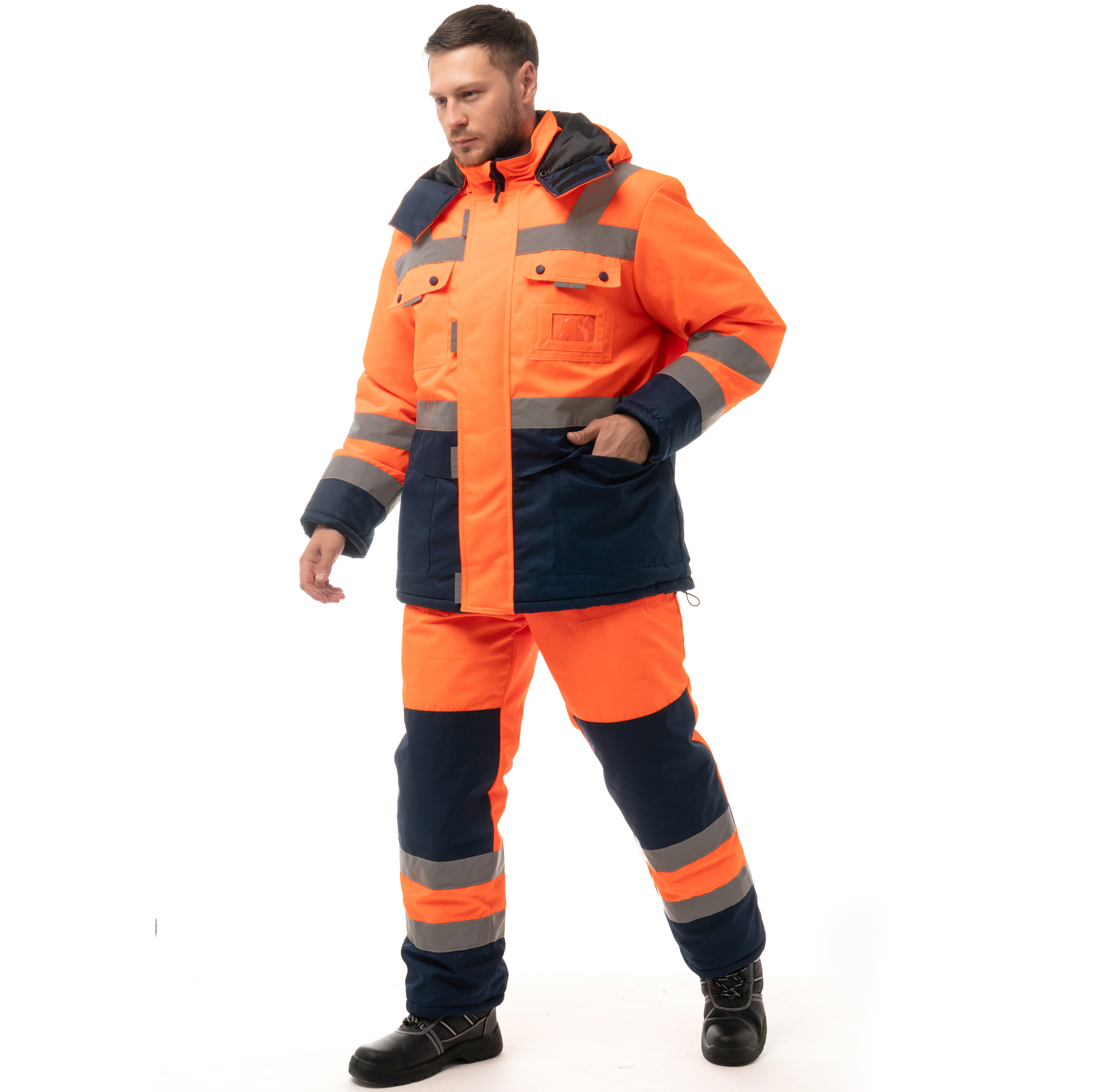 Костюм утепленный "НОРДИК" изготовлен в соответствии с ГОСТ и включает в себя два предмета: куртка / полукомбинезон. Центральная застежка изделия – молния с ветрозащитной планкой на липучку. На модели расположены накладные карманы с клапанами на кнопках, карман для бейджа, нижние накладные карманы и внутренний карман на подкладке. Для сохранения тепла на куртке предусмотрена ветрозащитная юбка на подкладке и утяжка по низу. Воротник-стойка имеет флисовую подкладку для дополнительного тепла. Костюм оснащен съемным капюшоном, который можно регулировать по объему лицевой части и использовать с каской. Трикотажные манжеты по низу рукавов регулируют посадку. Накладные карманы на передних половинках п/к обеспечивают удобный доступ к необходимым вещам. Для лучшего прилегания на изделии присутствует ткацкая резинка по линии талии. В области колен на задних половинках усилительные накладки. Для безопасной работы сотрудника в местах с плохим освещением на костюме «НОРДИК» предусмотрена световозвращающая лента в 2 ряда.