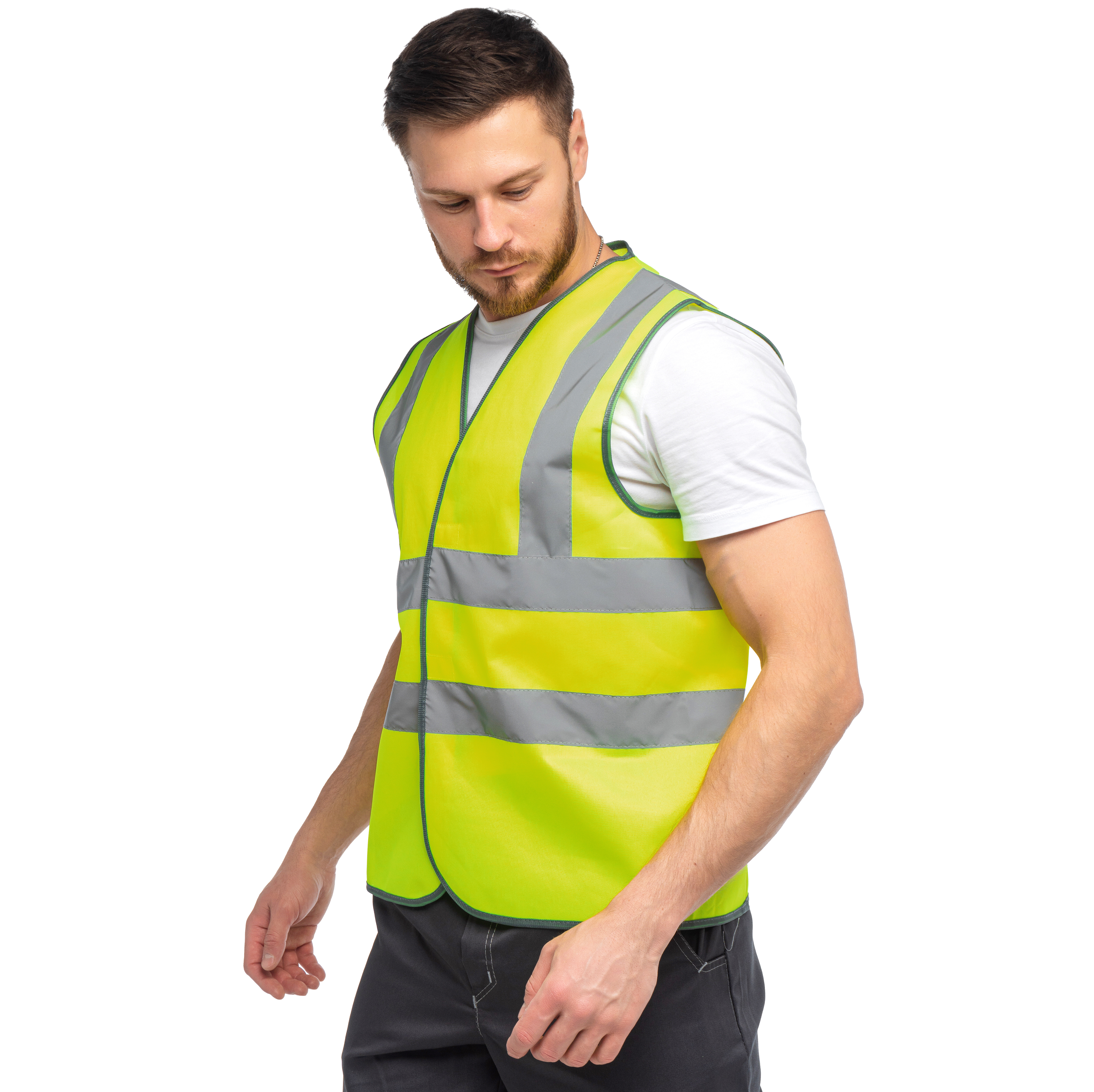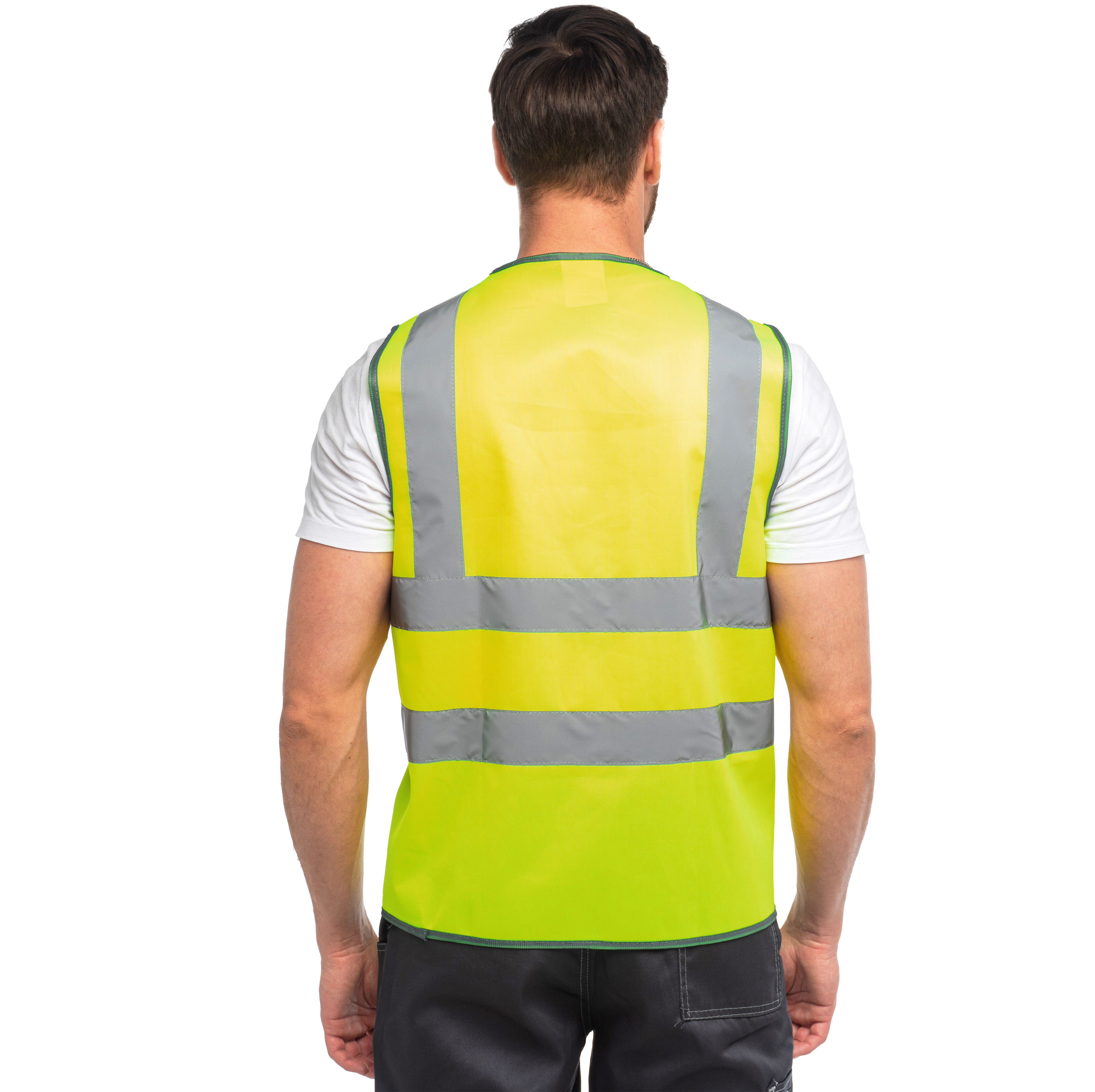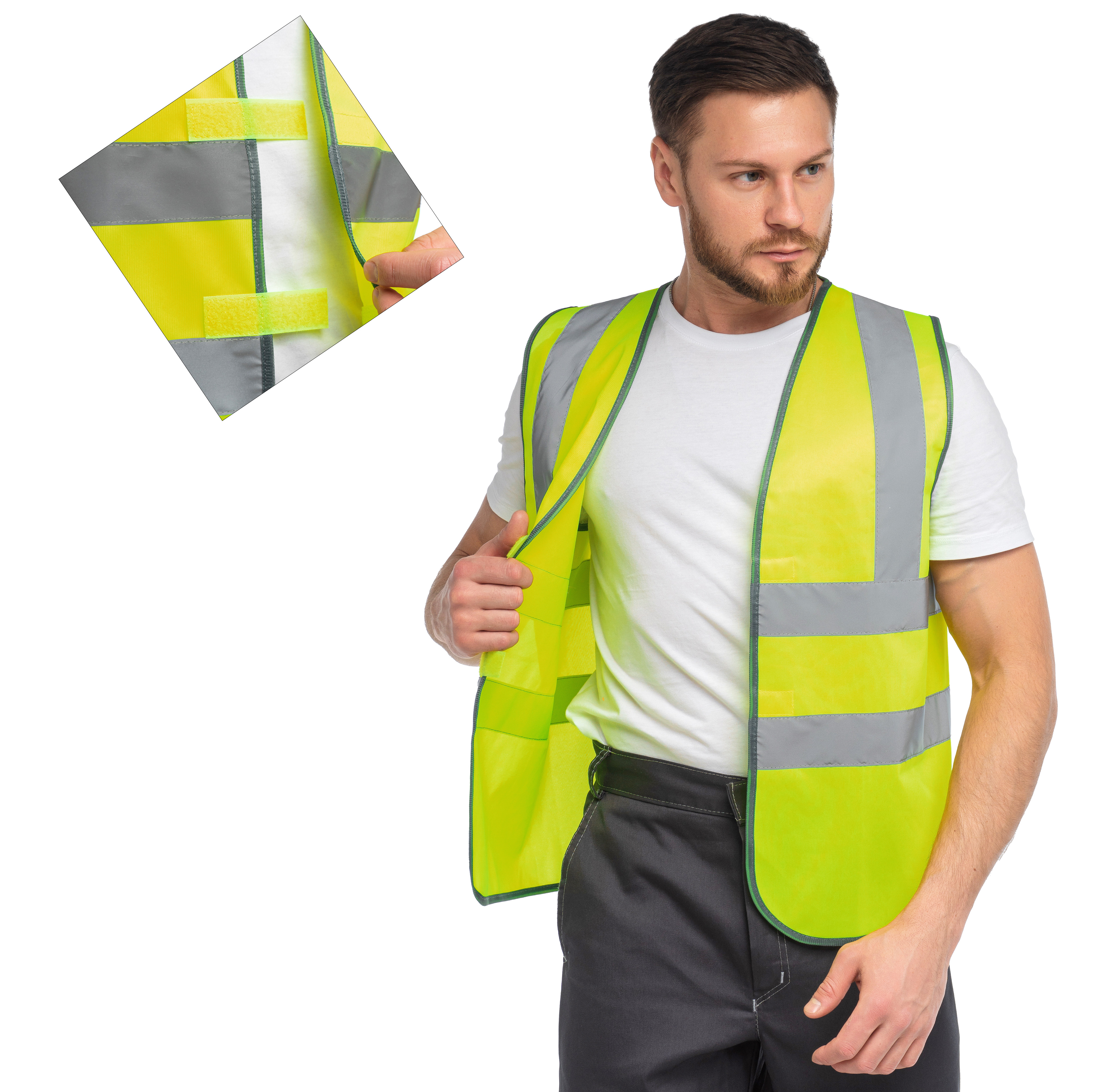 Жилет сигнальный изготовлен в соответствии с ГОСТ. Изделие выполнено из трикотажного полотна (100% ПЭ, плотностью120 гр./м², ВО отделкой). Для безопасной работы сотрудника в местах с плохим освещением на сигнальном жилете предусмотрено 4 светоотражающих полосы 50 мм.Объем регулируется по ширине на 4 см, за счет удлинённой ответной части липучки.