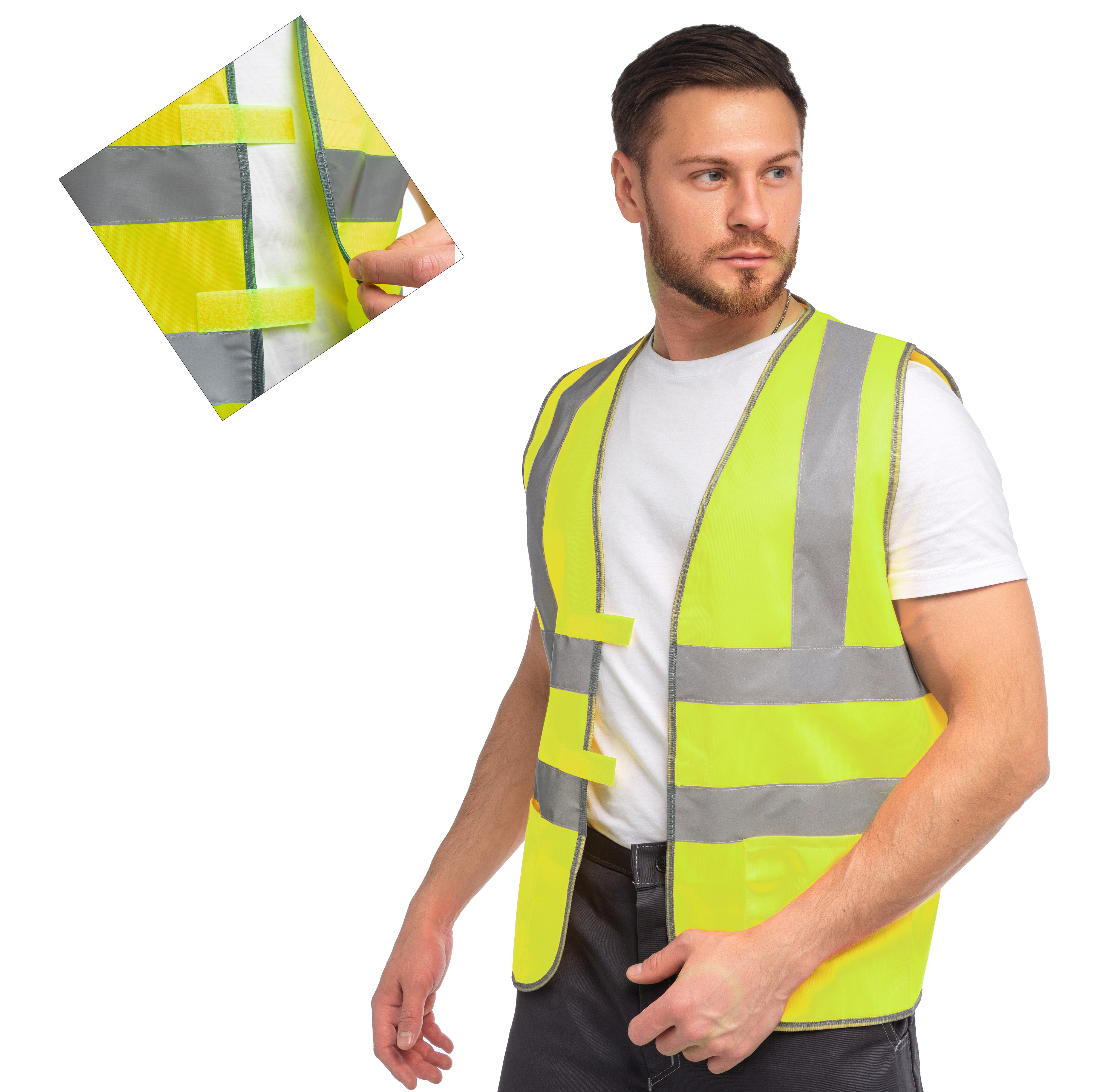 Жилет сигнальный изготовлен в соответствии с ГОСТ. Изделие выполнено из трикотажного полотна (100% ПЭ, плотностью120 гр./м², ВО отделкой). Для безопасной работы сотрудника в местах с плохим освещением на сигнальном жилете предусмотрено 4 светоотражающих полосы 50 мм. Жилет с накладными карманами, окантовочной тесьмой по пройме и периметру. Объем регулируется по ширине на 4 см, за счет удлинённой ответной части липучки.