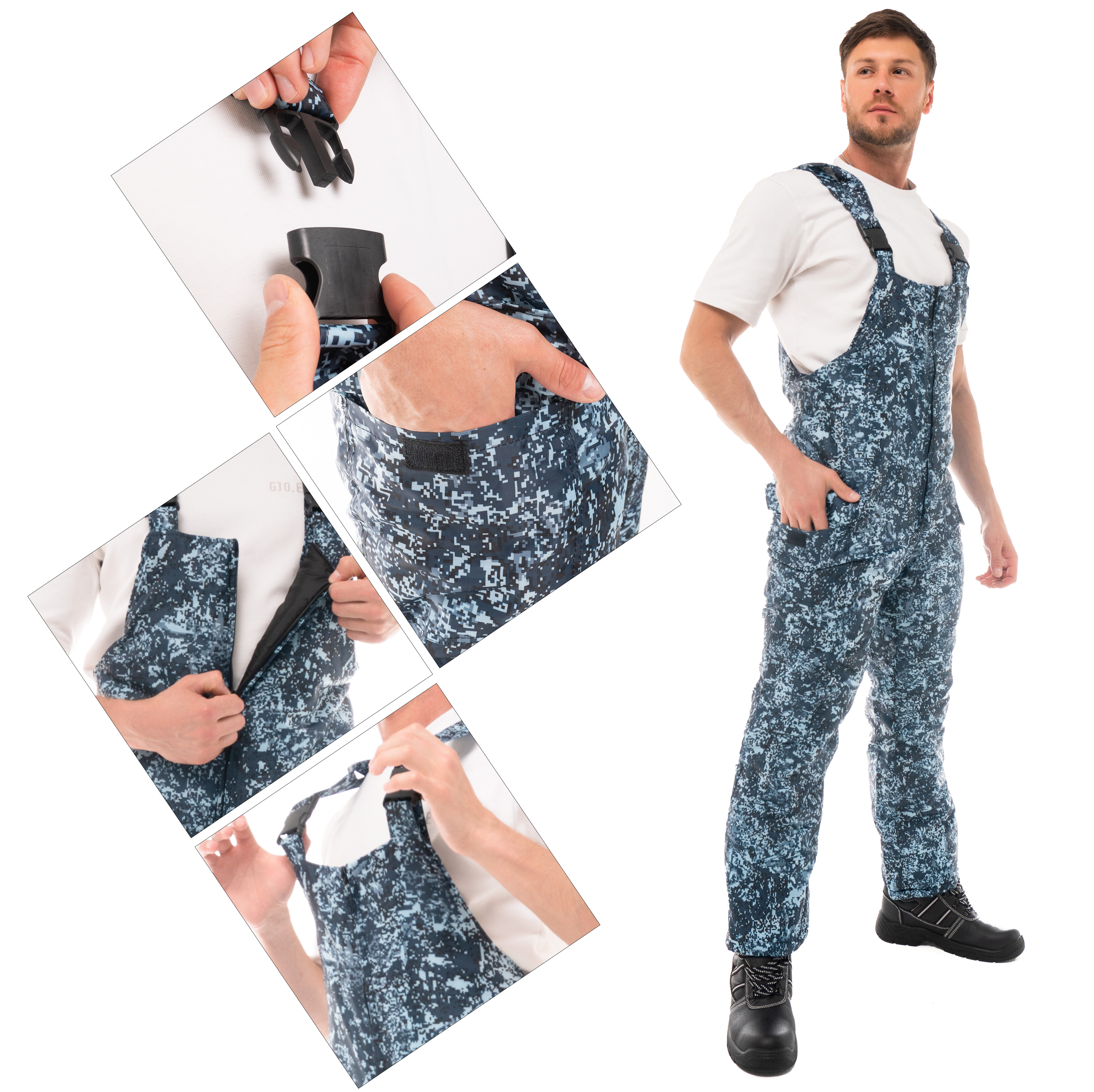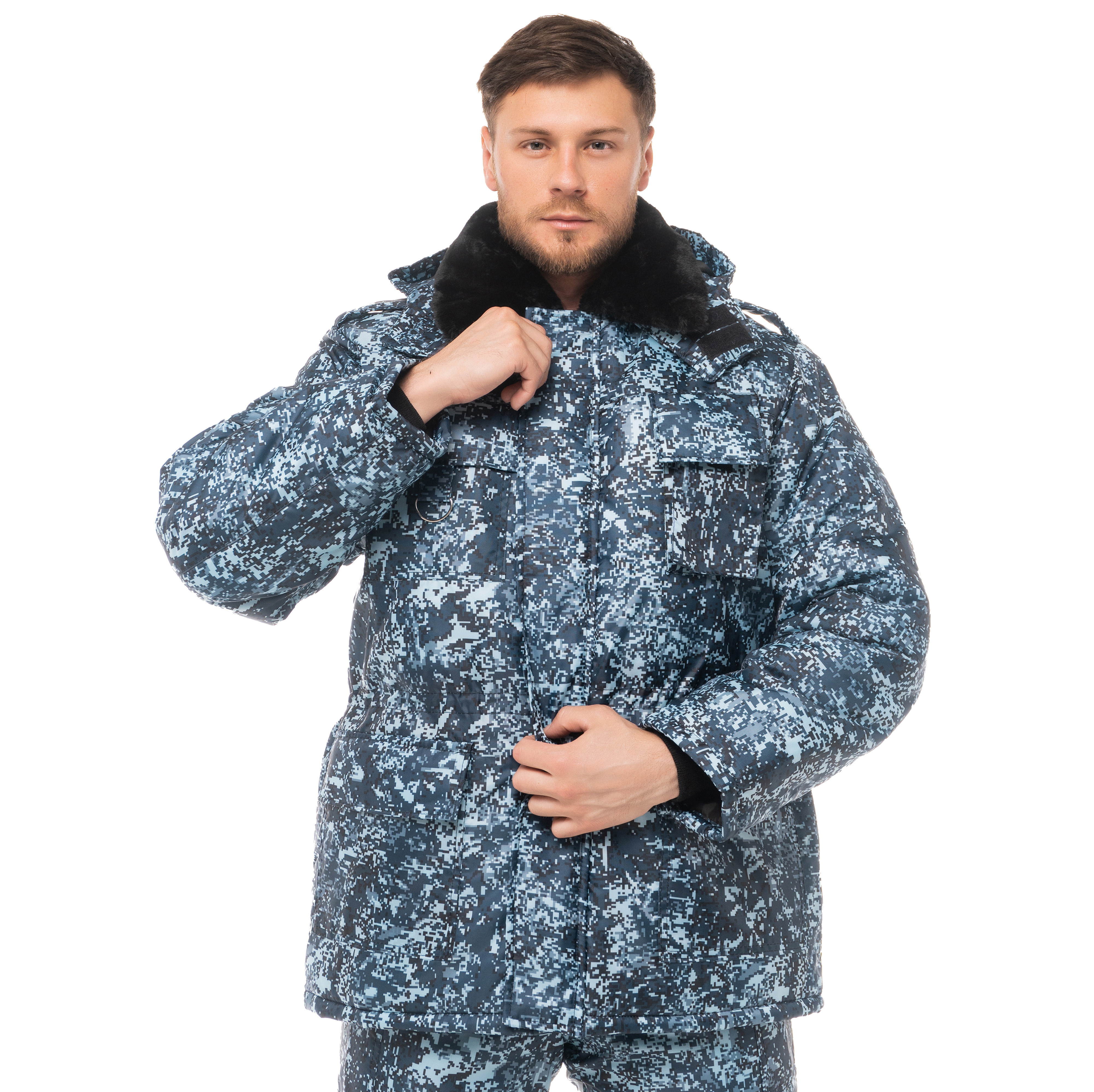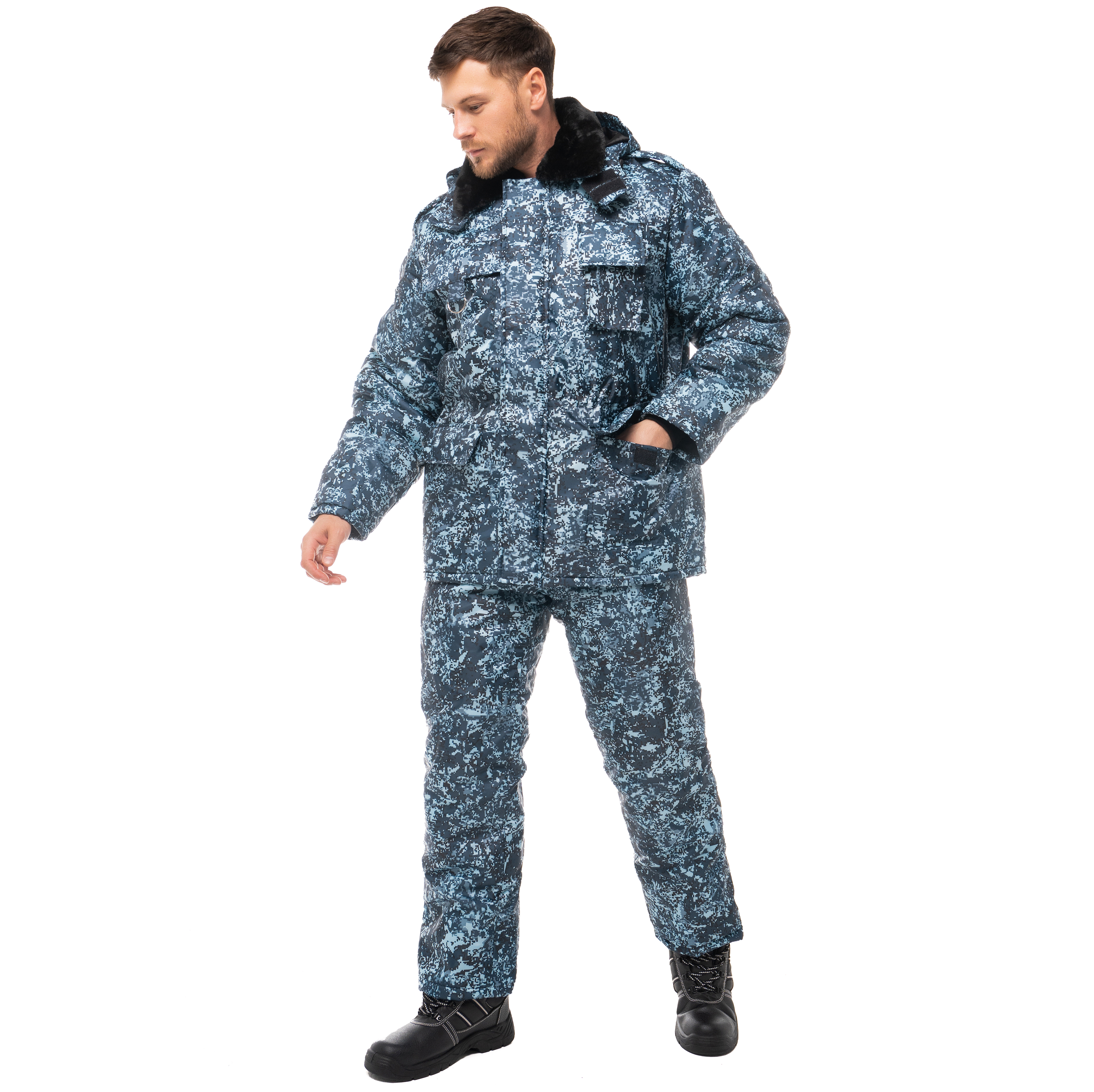Костюм утепленный "ОХРАННИК" КМФ цифра изготовлен в соответствии с ГОСТ. Куртка закрывается молнией, скрытой под ветрозащитной планкой, зафиксированной на липучках. В куртке также предусмотрен меховой воротник для тепла. На груди располагается карман для рации, а также накладной карман с клапаном и полукольцом для бейджа. Нижние карманы куртки оборудованы клапанами, застегивающимися на липучку. Для обеспечения оптимальной посадки предусмотрена регулировка ширины изделия по талии. Манжеты на низу рукавов выполнены из трикотажа. Куртка также имеет погоны на пуговицах, а капюшон можно снять и отрегулировать его объем по лицевой части. Полукомбинезон оснащен накладными карманами и клапанами, закрывающимися на липучку на боковых швах. Наконец, куртка дополнена эластичной резинкой по талии спинки для лучшей посадки.