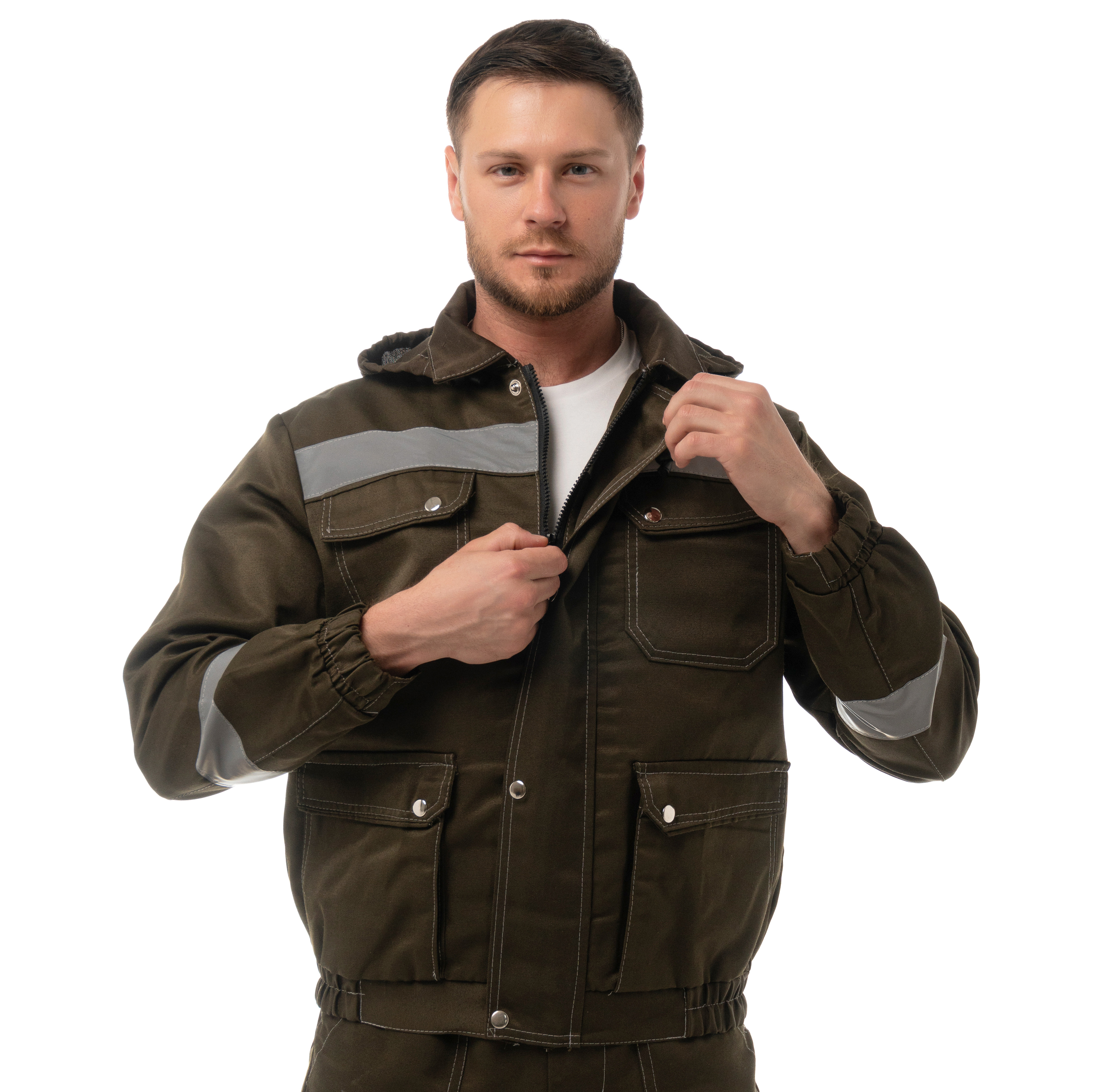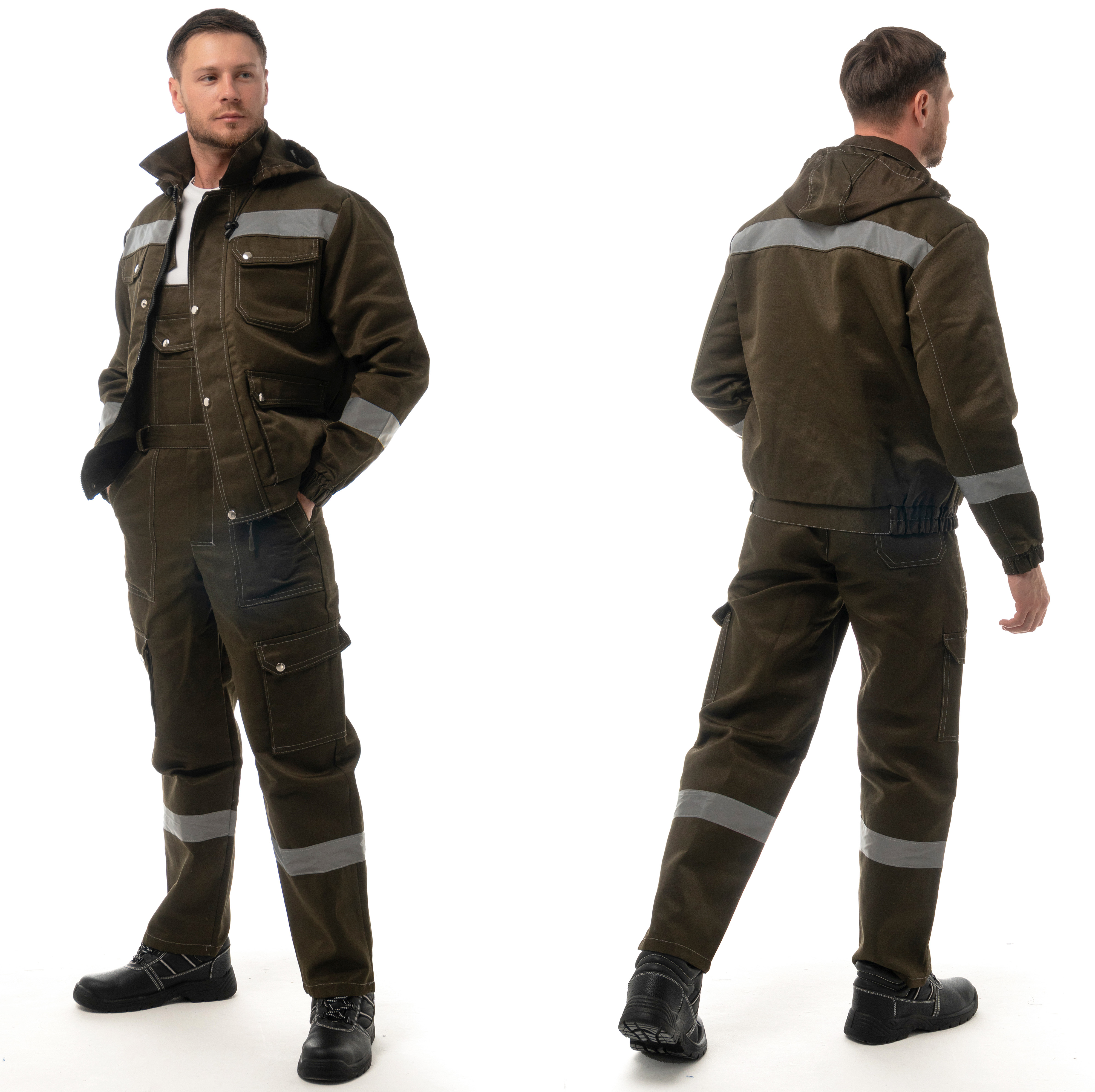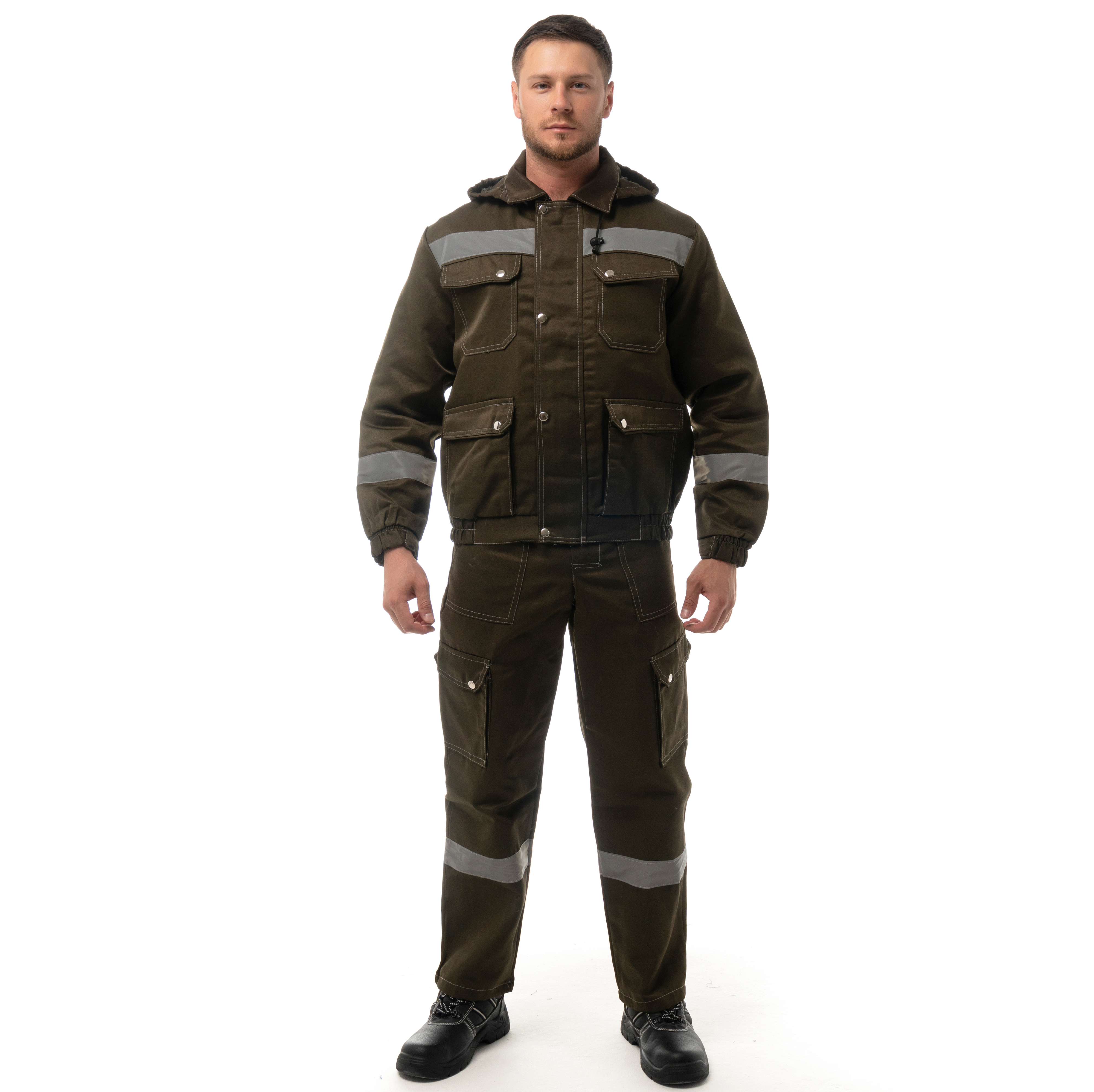Костюм "АНТЕЙ" изготовлен в соответствии с ГОСТ и включает 2 предмета: куртка/полукомбинезон. Костюм с контрастной отстрочкой. На изделии расположены верхние накладные карманы с фигурными клапанами и перекантом на кнопках, нижние карманы с полуобъемом, с фигурными клапанами и перекантом на кнопках. Модель куртки представлена в укороченном варианте на поясе с частичной стяжкой на эластичной резинке. Куртка оснащена съемным капюшоном на пуговицах с регулировкой объема по лицевой части. На полукомбинезоне расположены многофункциональными карманы для хранения мелочей Эластичная резинка по талии спинки фиксирует посадку. Гульфик застегивается на молнию и застежку в правом боковом шве. Для безопасной работников в костюме "АНТЕЙ" предусмотрена световозвращающая полоса шириной 50 мм.