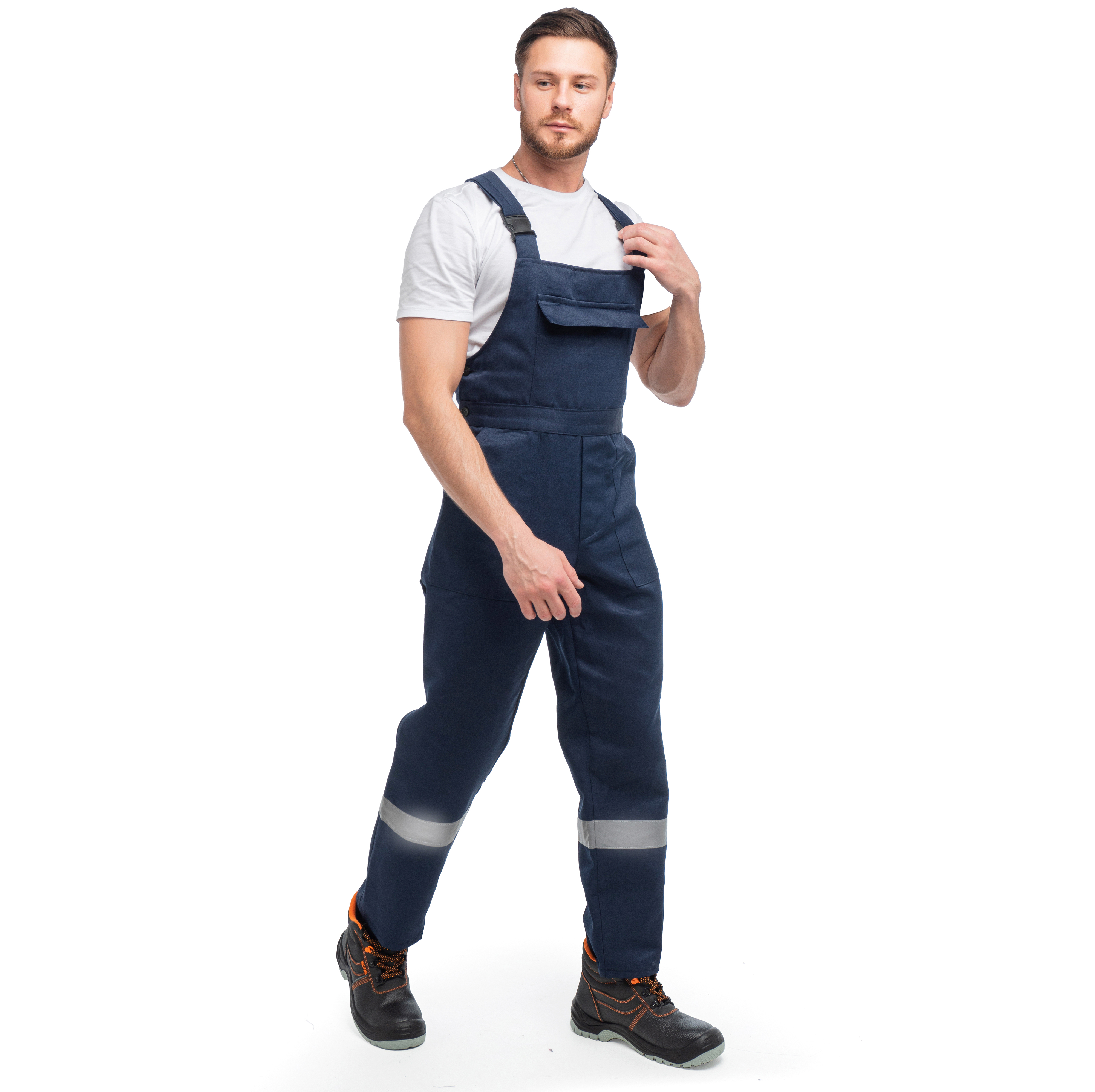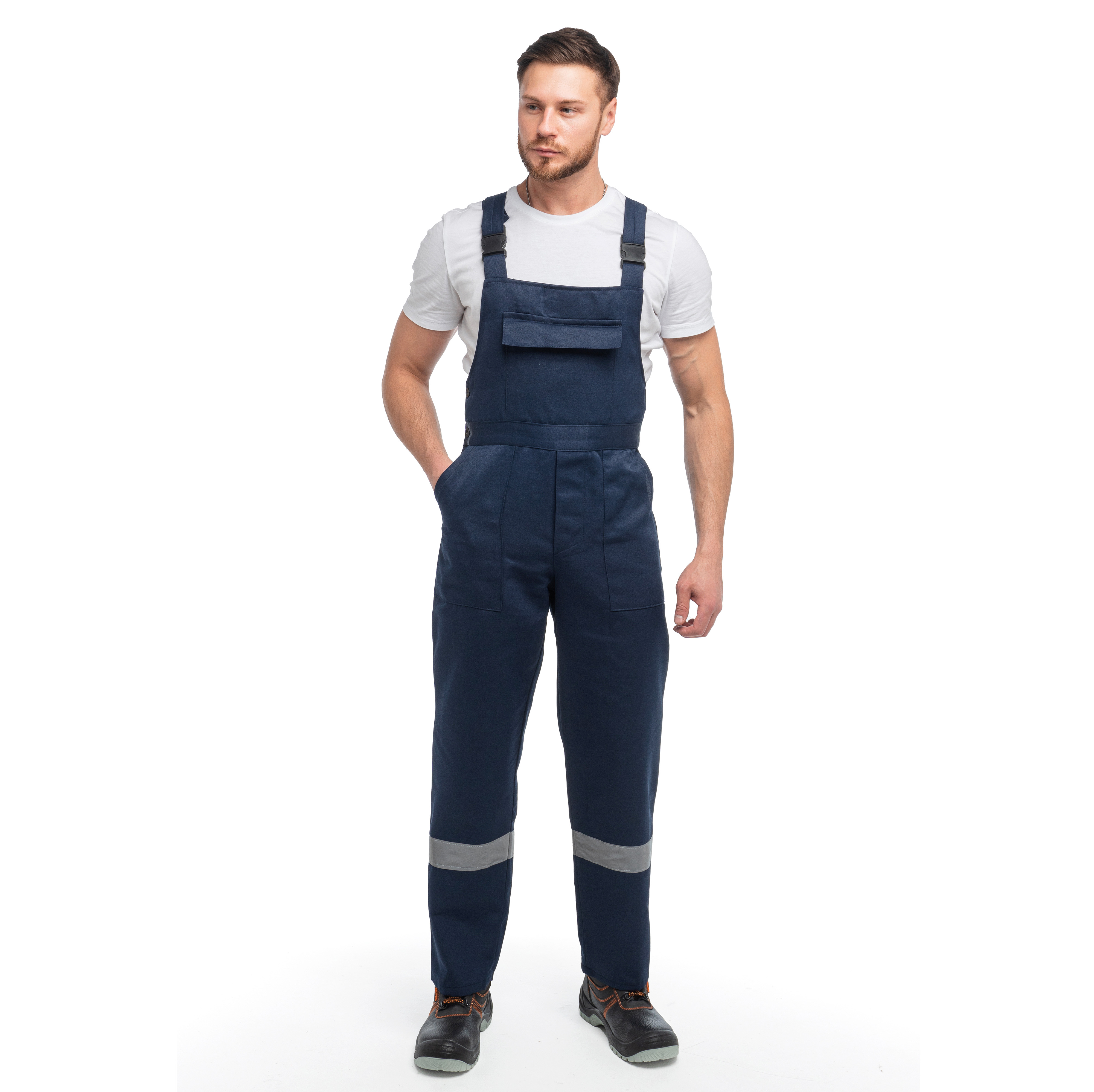 Полукомбинезон «СТАНДАРТ» С СОП изготовлен в соответствии с ГОСТ. На изделии расположены накладные карманы с боковым входом на передних половинках. Гульфик застегивается и в правом боковом шве на пуговицы. Нагрудный накладной карман с клапаном, с делением под ручку. На задней половинке полукомбинезона размещен накладной карман под инструменты. Эластичная резинка по талии спинки фиксирует посадку. Бретели на пластиковых застежках (фастексах) регулируются по длине за счет эластичной резинки. Для безопасной работы сотрудника в местах с плохим освещением на костюме «СТАНДАРТ» предусмотрена светоотражающая полоса 50 мм.