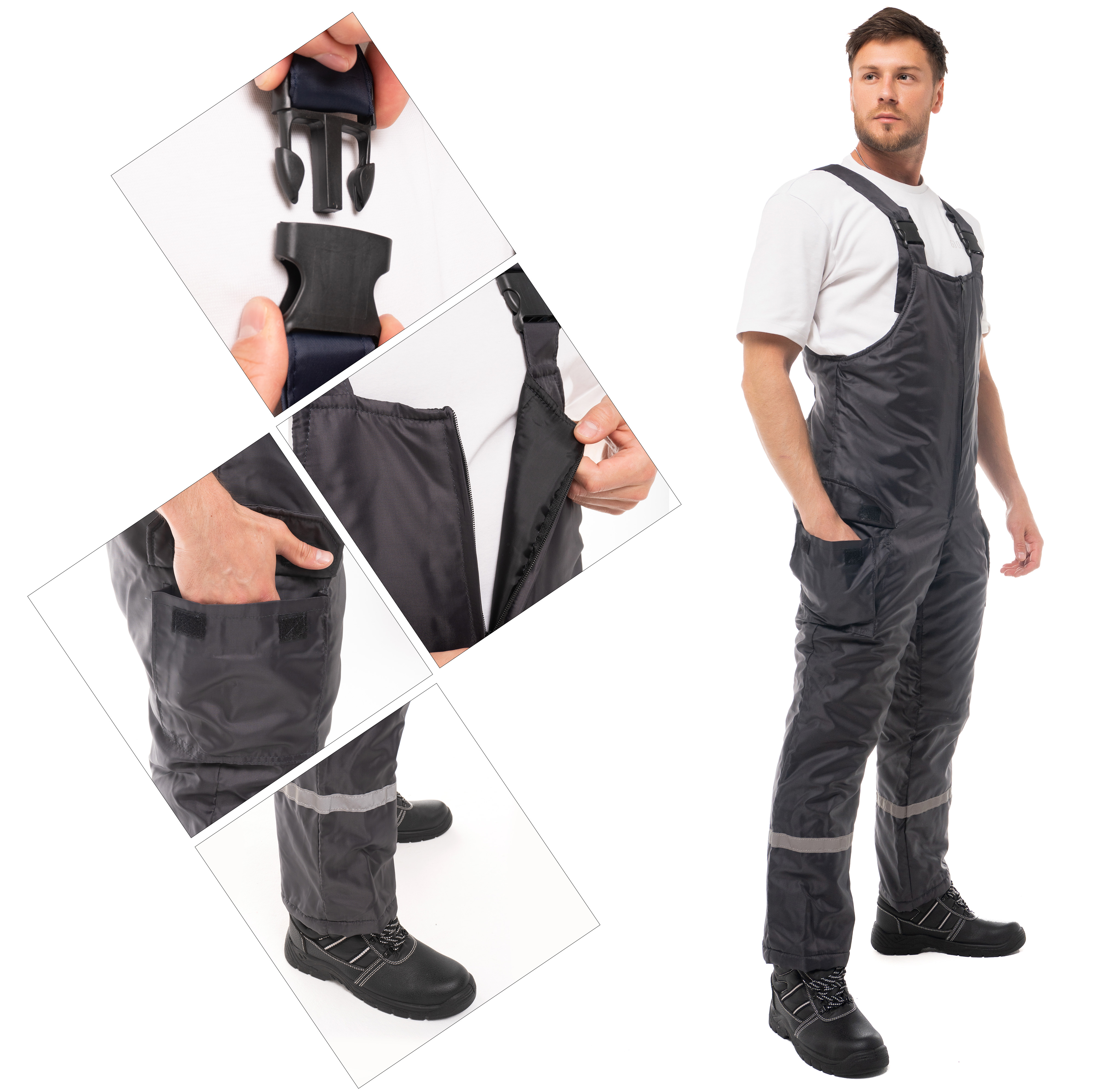 Центральная застежка утепленного полукомбинезона - молния. Боковые объемные карманы с клапанами на ленте-контакт. На спине вдоль линии талии есть эластичная резинка для регулировки посадки. Для безопасной работы сотрудника в местах с плохим освещением на костюме «Антей» предусмотрена световозвращающий кант и полоса шириной 25 мм.