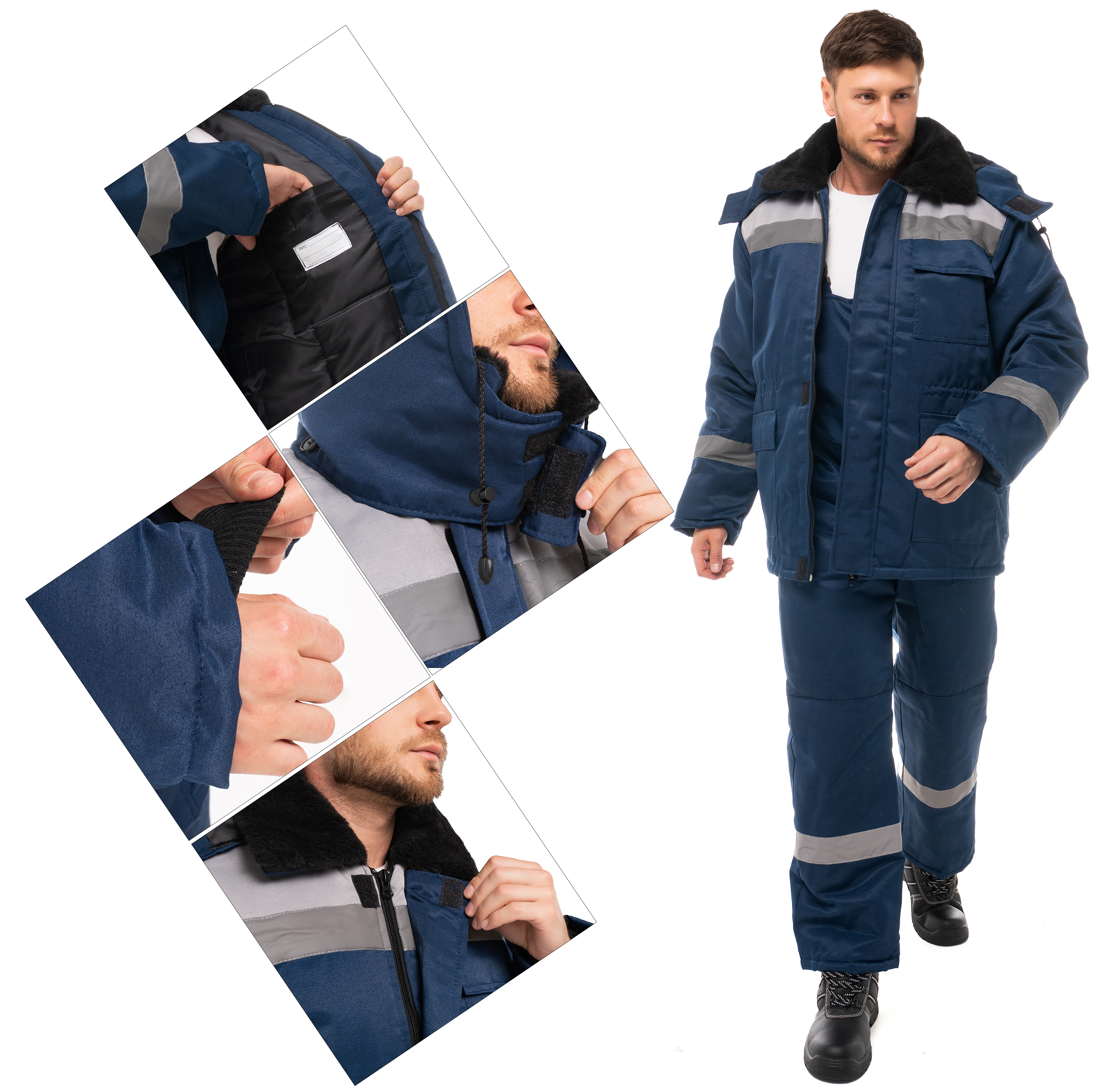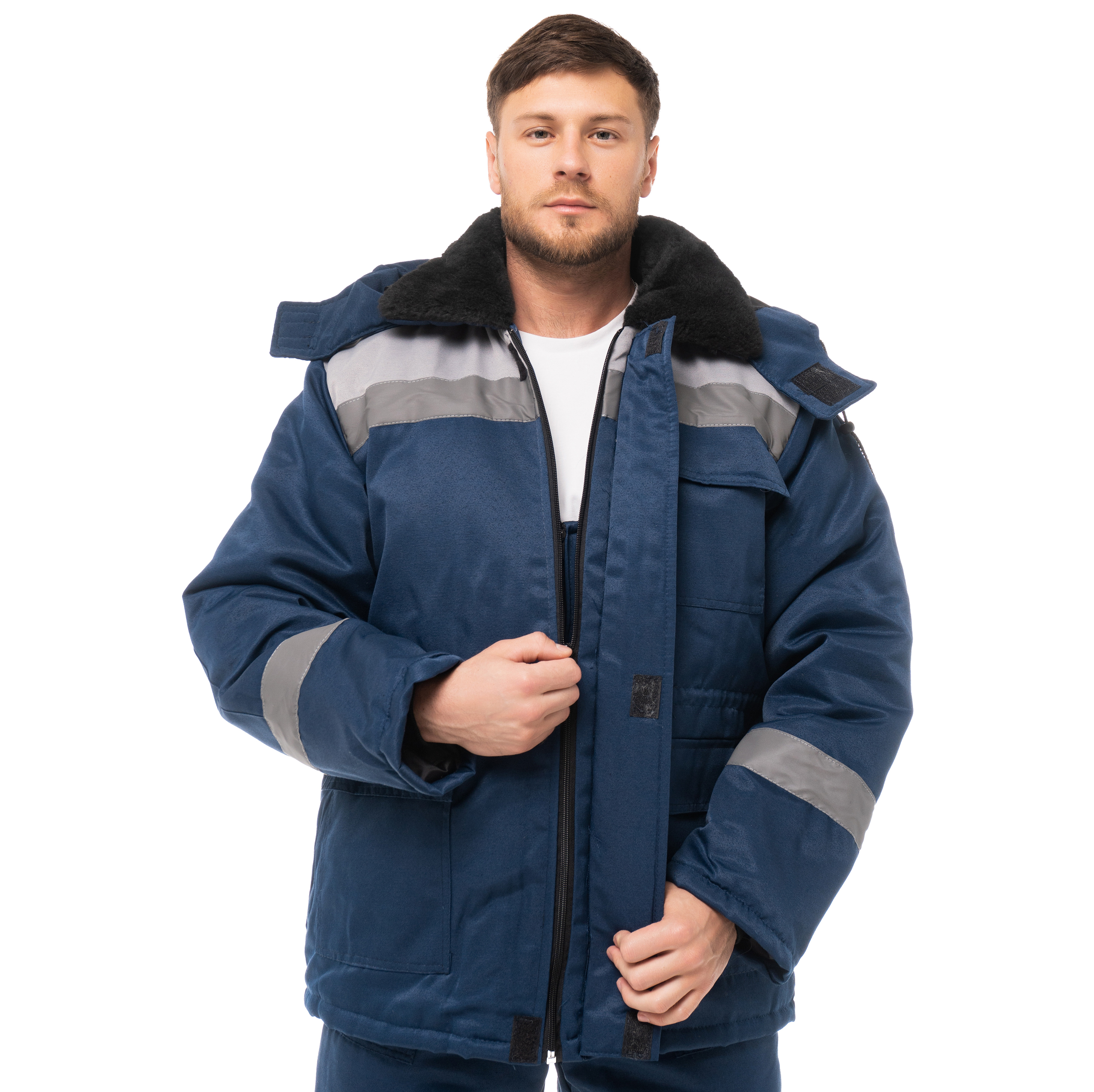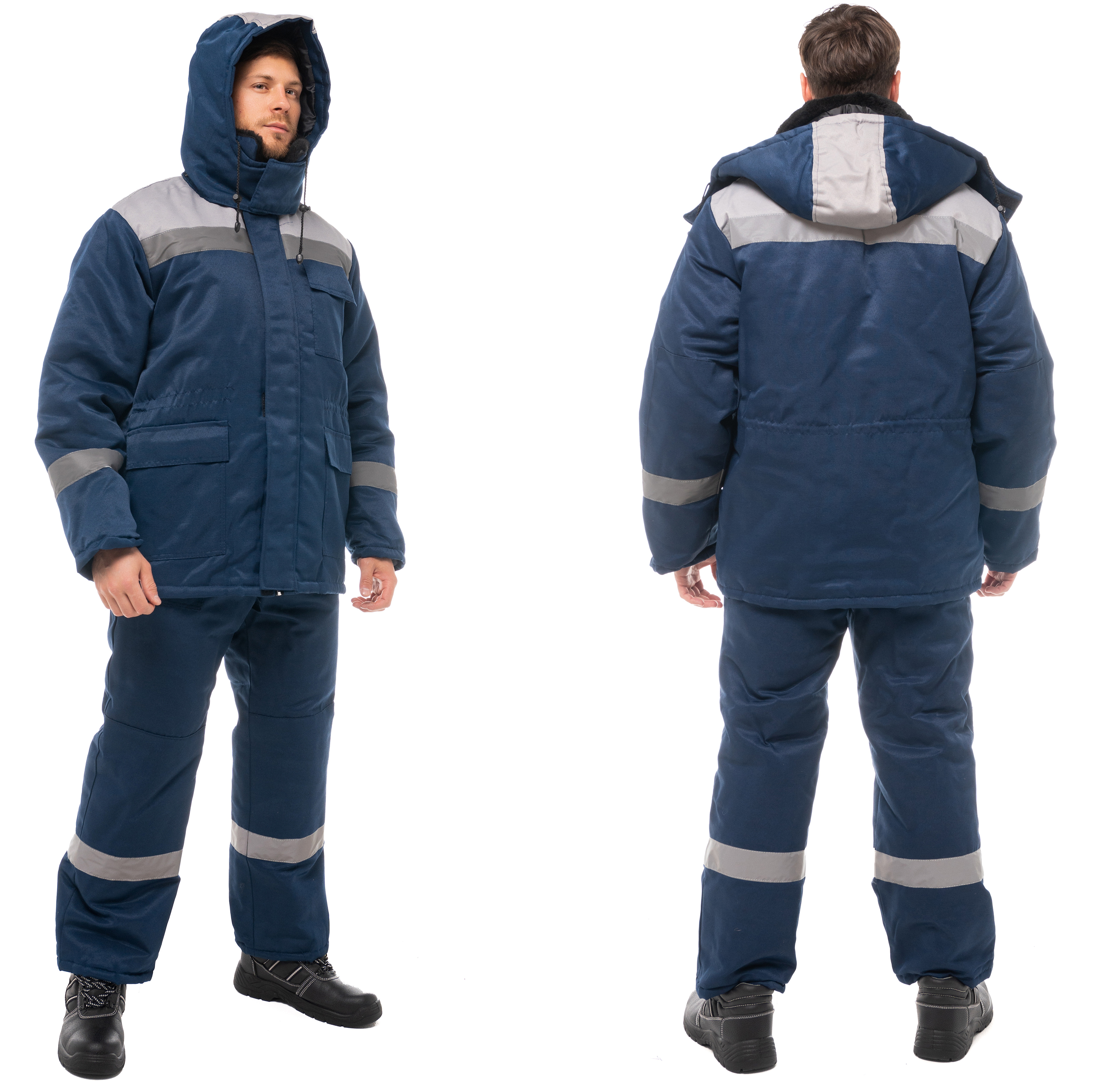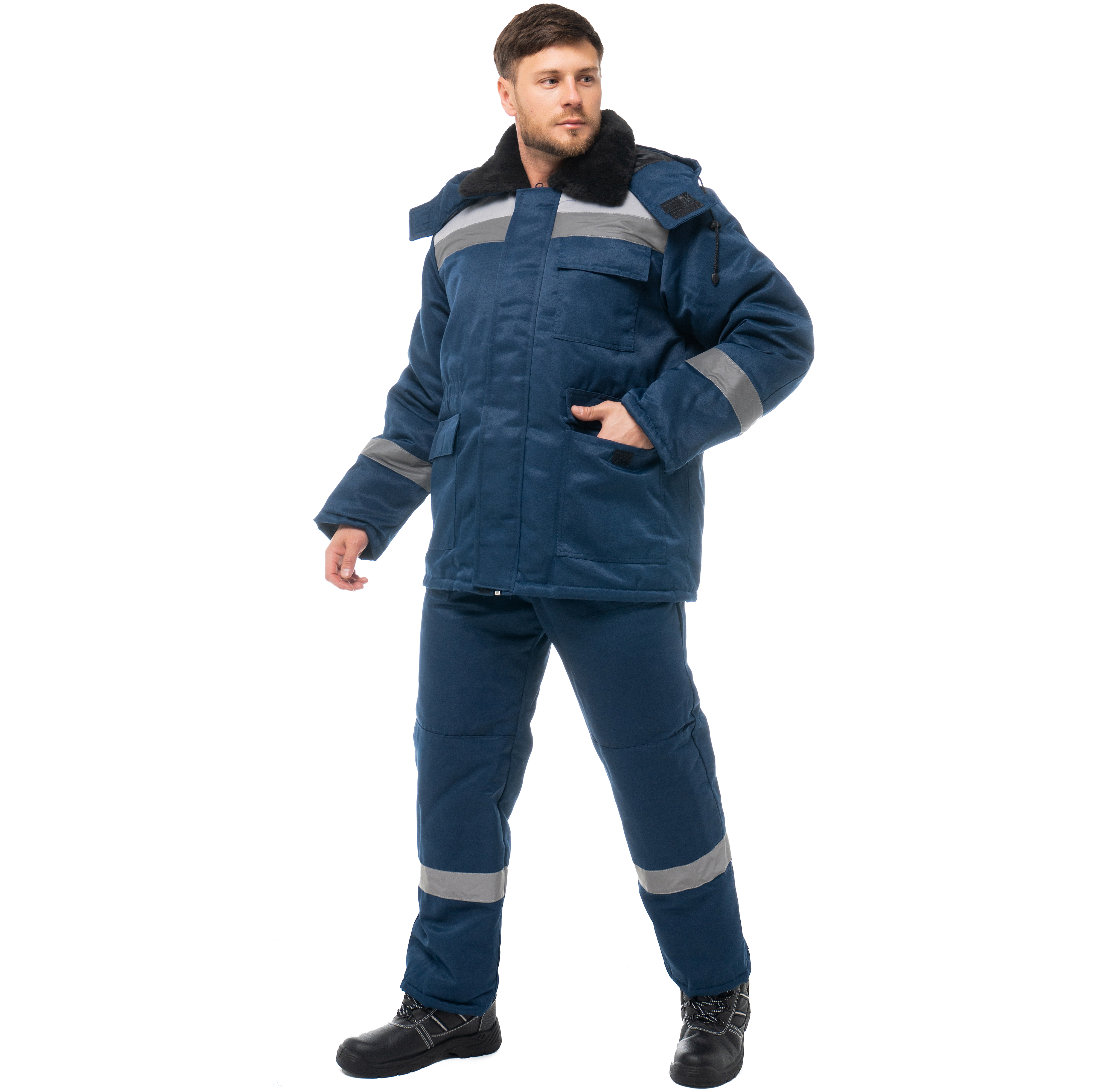 Костюм утепленный "СТАНДАРТ Люкс" изготовлен в соответствии с ГОСТ и включает в себя 2 предмета: куртка / полукомбинезон. Удлиненная куртка прямого силуэта с ветрозащитной планкой с застежкой на ленту-контакт. На куртке расположены накладные карманы с клапанами с застежкой на ленту-контакт. Ширина изделия регулируется по талии куртки. Изделие оснащено утепленным съемным капюшоном и меховым воротником. Центральная застежка утепленного полукомбинезона - молния. Полукомбинезон фиксируется бретелями с эластичной резинкой, на нем расположены накладные карманы с наклонным входом. Для безопасной работы сотрудника в местах с плохим освещением на костюме «СТАНДАРТ Люкс» предусмотрена световозвращающая полоса шириной 50 мм.