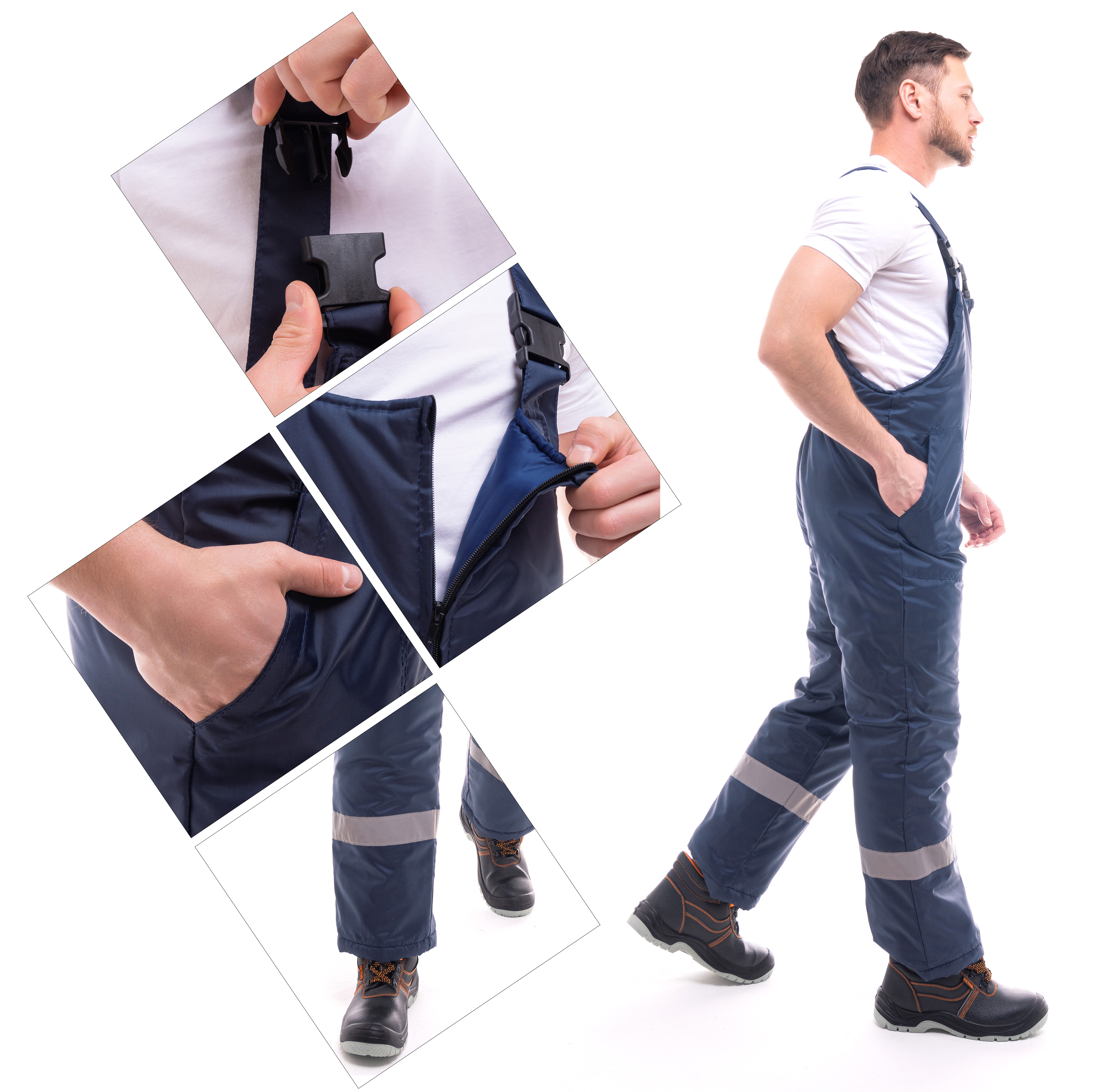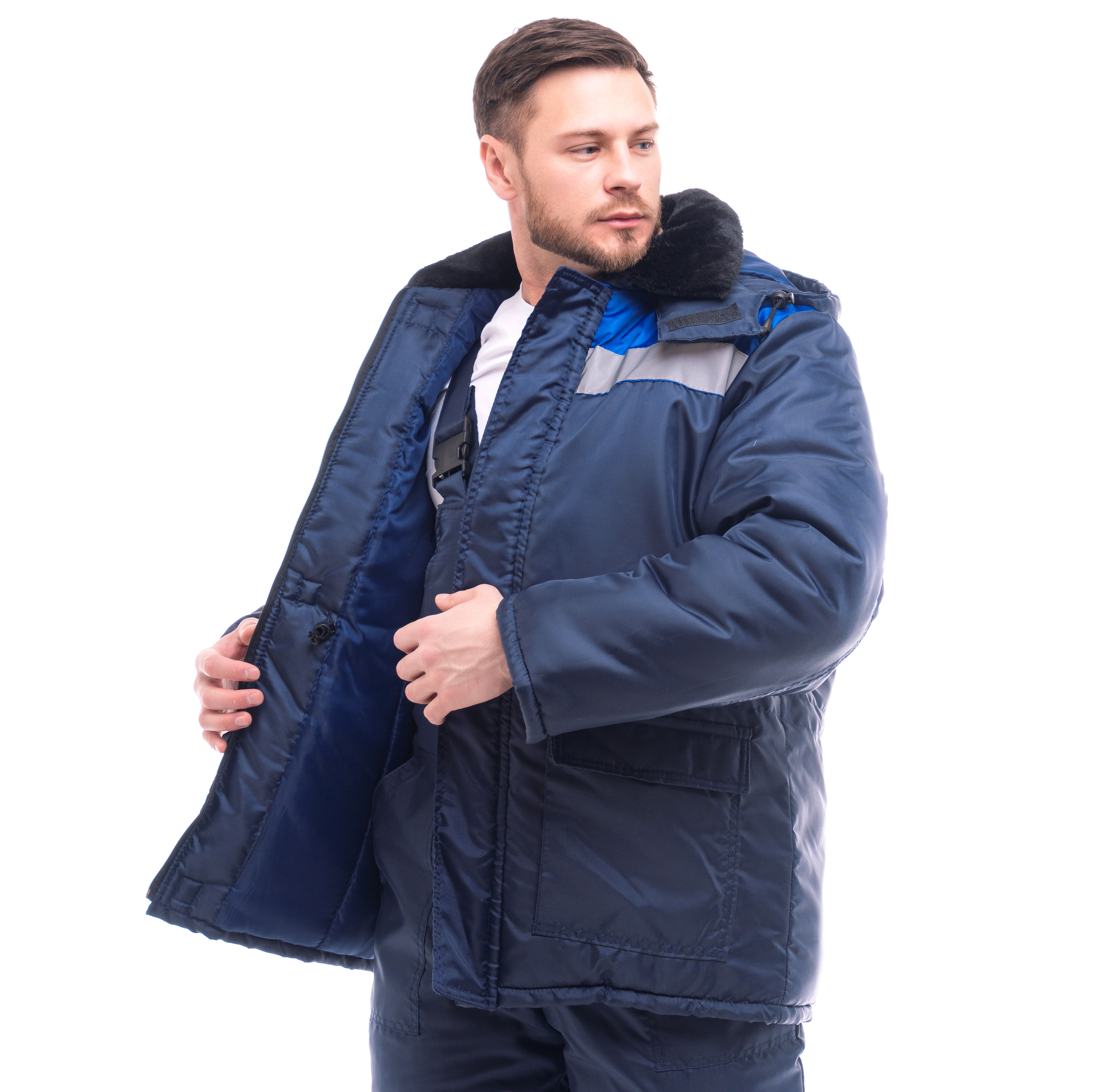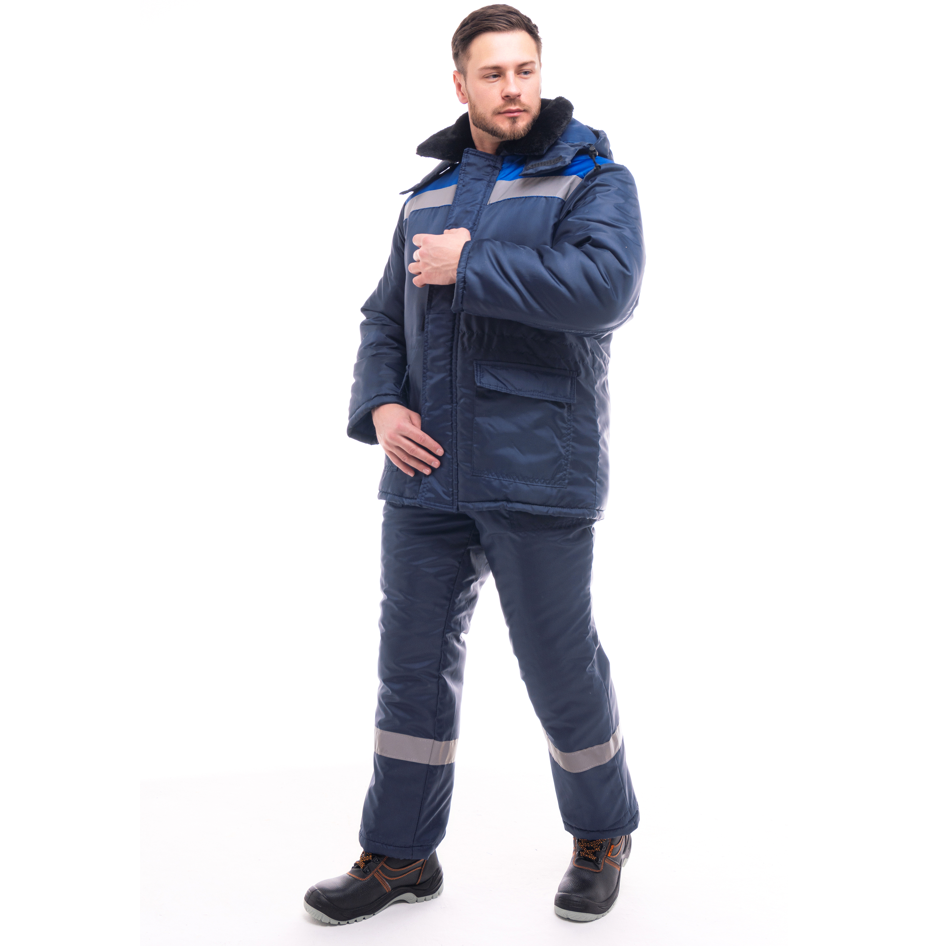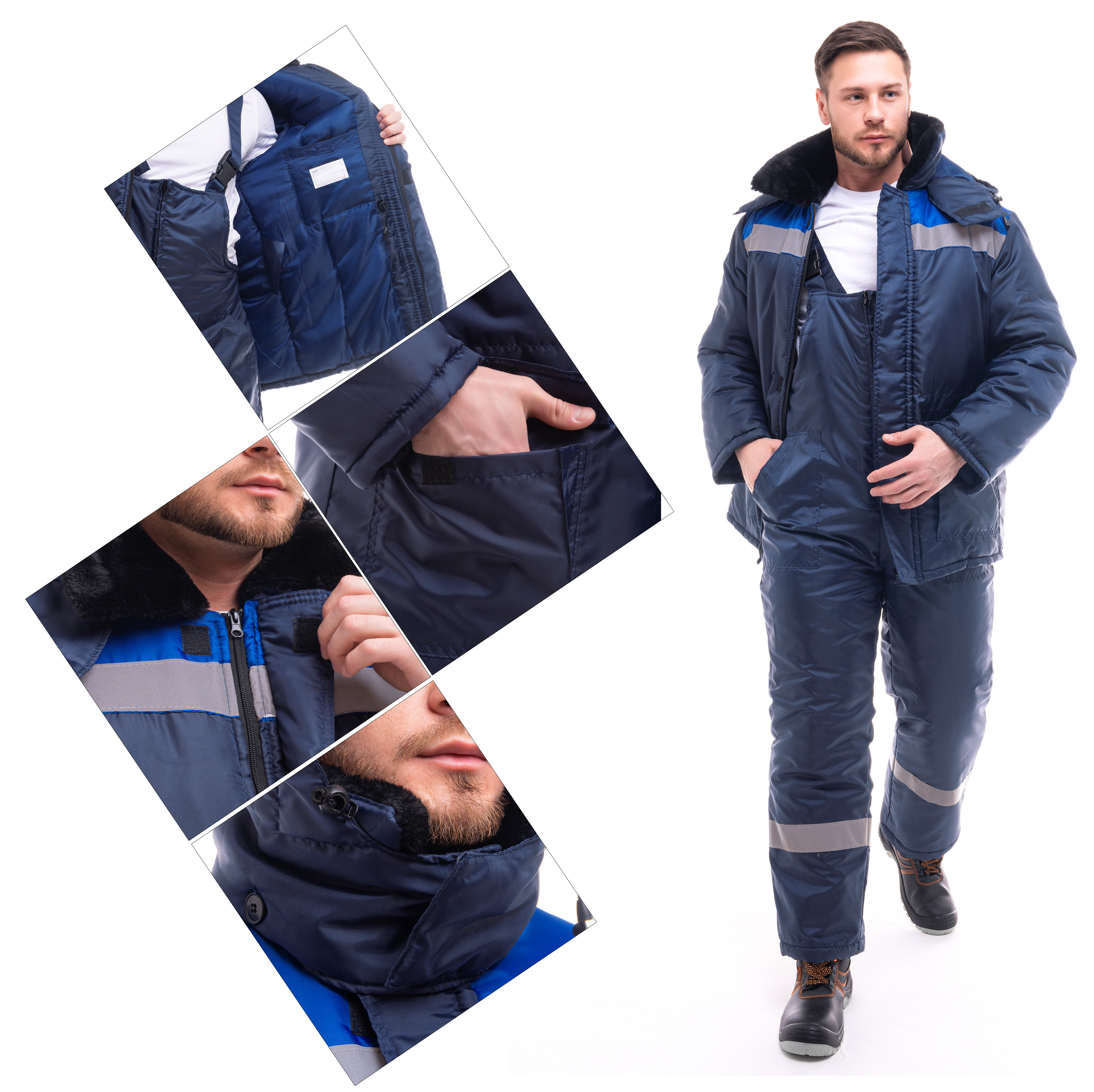 Костюм утепленный "СТАНДАРТ Оксфорд", изготовлен в соответствии с ГОСТ и включает в себя 2 предмета: куртка / полукомбинезон. Удлиненная куртка прямого силуэта с ветрозащитной планкой с застежкой на ленту-контакт. На куртке расположены накладные карманы с клапанами с застежкой на ленту-контакт. Ширина изделия регулируется по талии куртки. Изделие оснащено утепленным съемным капюшоном и меховым воротником. Центральная застежка утепленного полукомбинезона - молния. Полукомбинезон фиксируется бретелями с эластичной резинкой, на нем расположены накладные карманы с наклонным входом. Для безопасной работы сотрудника в местах с плохим освещением на костюме «СТАНДАРТ Оксфорд» предусмотрена световозвращающая полоса шириной 50 мм.